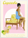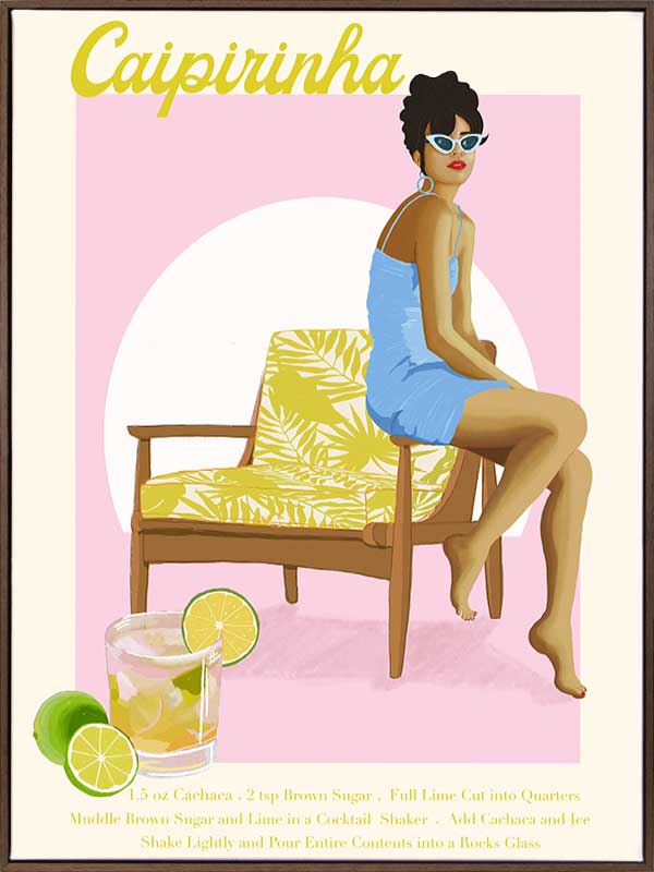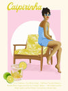 Caipirinha Poster - Playful yet sophisticated fashion style illustration featuring a women sitting on the arm of a yellow palm tree printed lounge chair. wearing pointed sunglasses and short baby blue dress to match. The colour pallet is bright and feminine, featuring yellow, a pop of blue and pink tones.