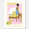 Caipirinha Poster - Playful yet sophisticated fashion style illustration featuring a women sitting on the arm of a yellow palm tree printed lounge chair. wearing pointed sunglasses and short baby blue dress to match. The colour pallet is bright and feminine, featuring yellow, a pop of blue and pink tones.