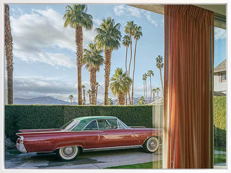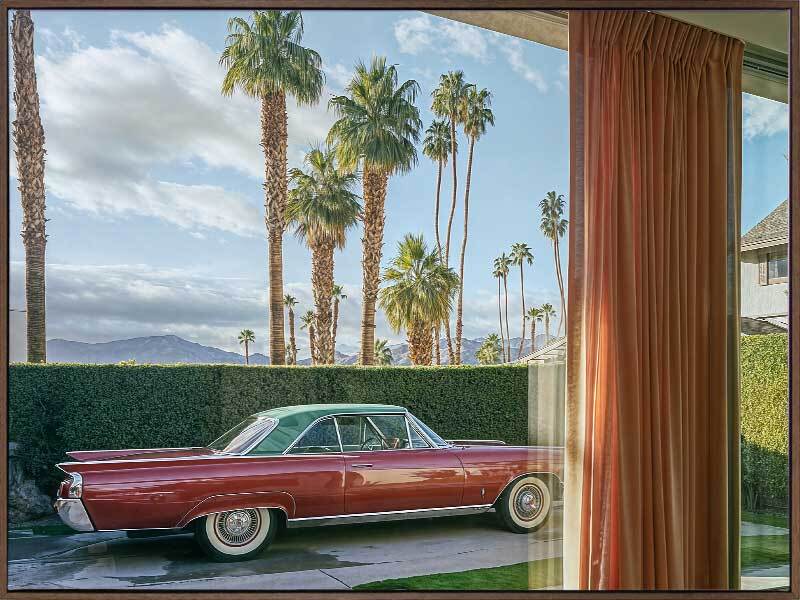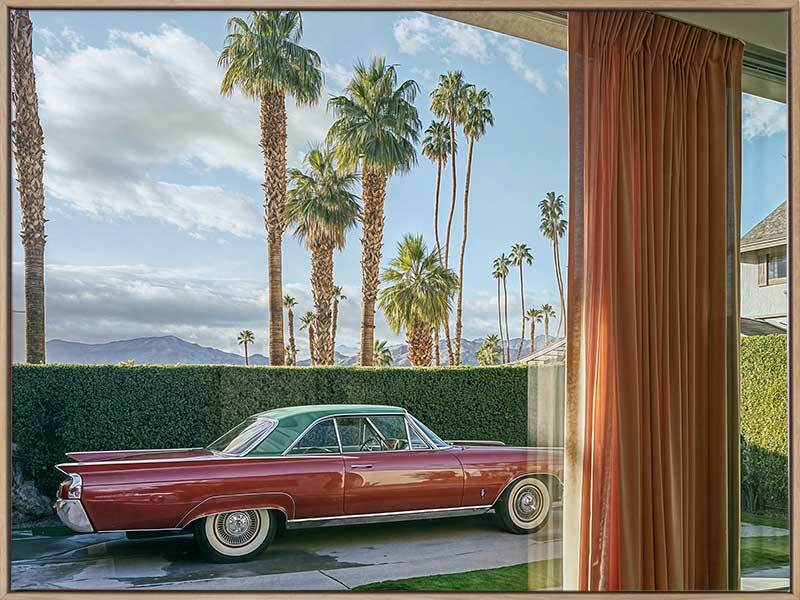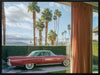 California Joy Rides Canvas Art Print - This striking photographic artwork captures a vintage car framed by palm trees and mid-century modern architecture. Tones of green, blue, brown, and red evoke a nostalgic Palm Springs vibe. A combination of American modern and retro styles, this wall art brings a timeless charm to any space.