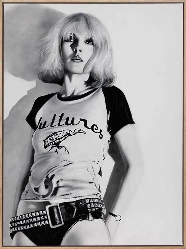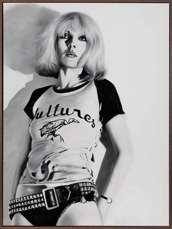 Call Me Canvas Art Print: A black and white art print of an oil-painted Blondie in an edgy outfit and pose. 2018 SPRING/SUMMER COLLECTION: REMINISCE