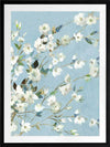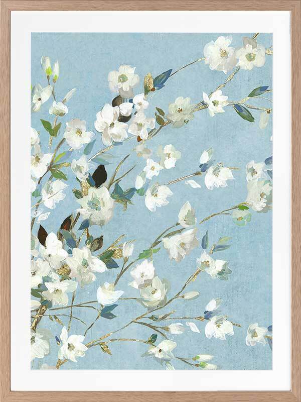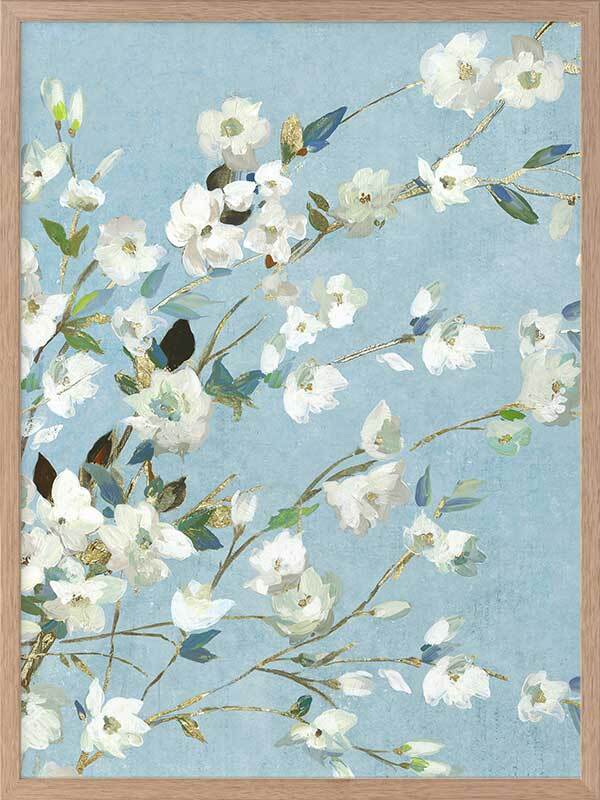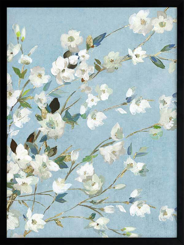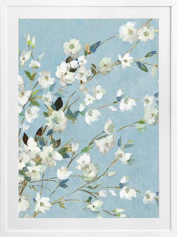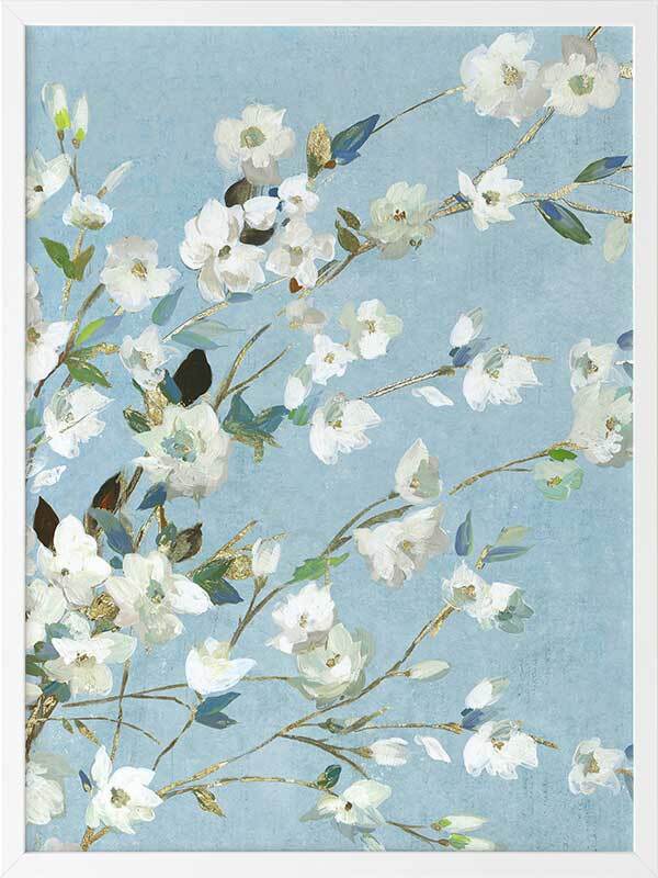 Calore II Framed Art Print - Pretty and elegant, this piece draws the eye across the room with long, wispy branches, fresh white flowers delicately perched atop, gently floating in the warm spring air. A pastel blue background gives it a soft, relaxed energy, with hints of golden shimmers illuminating the way.