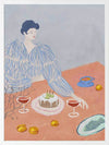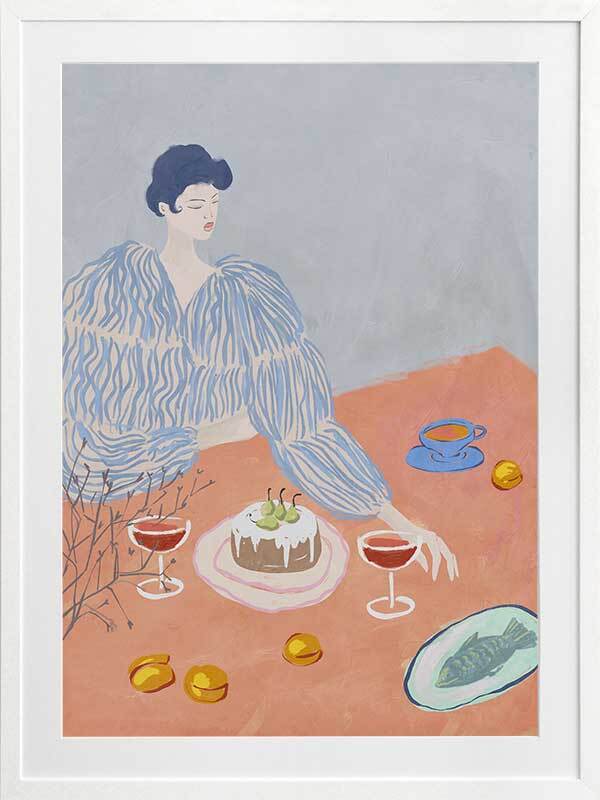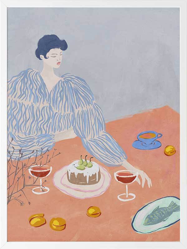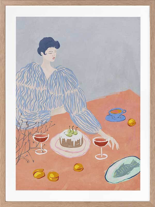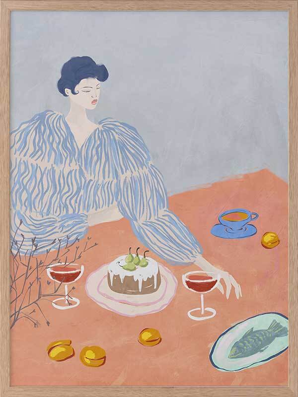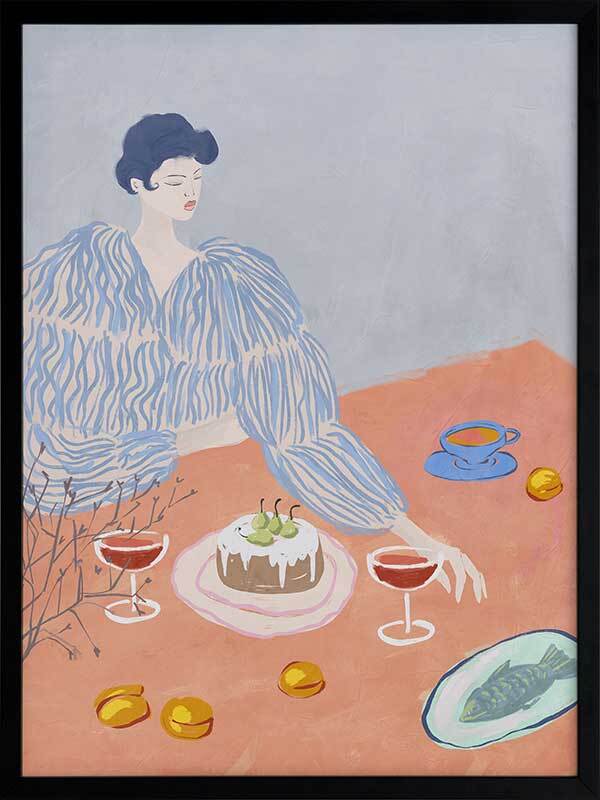 Camille Framed Art Print - Transport yourself to the enchanting world of European elegance with this inspired artwork. Set against the backdrop of contemporary European art styles, the piece invites you to join Camille in her sophisticated rendezvous of vin rouge and haute couture. Immerse yourself in the essence of European dining, adorned in elegant attire, savoring delectable cuisine, and relishing in the company of good wine. This captivating artwork exudes an inviting energy, while its complementary palette of blues and oranges adds a modern and versatile touch to any interior style.