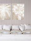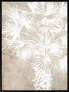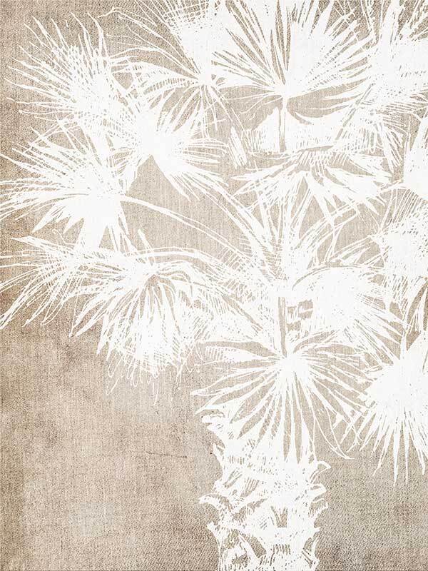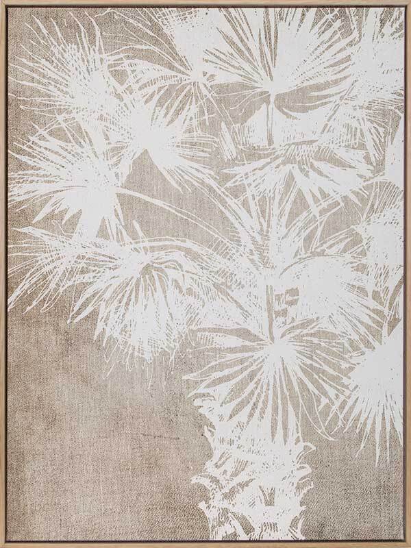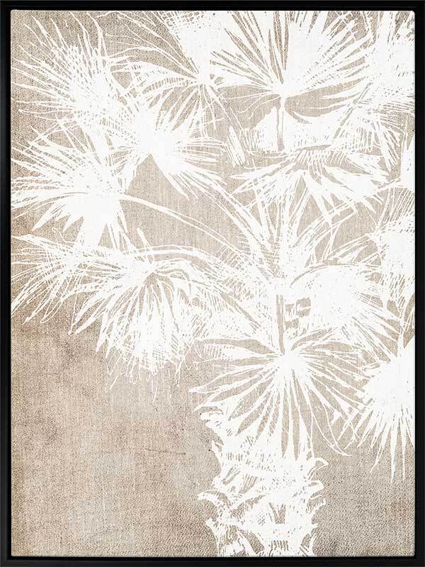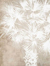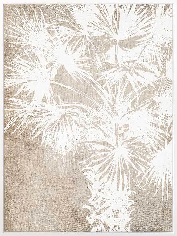 Canary Island II Canvas Art Print - A relaxed, tropical lino print style artwork that showcases a brilliant white impression of a Canary Island Date Palm splayed out against a textured, warm beige background. Pairs with Canary Island I.