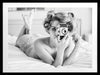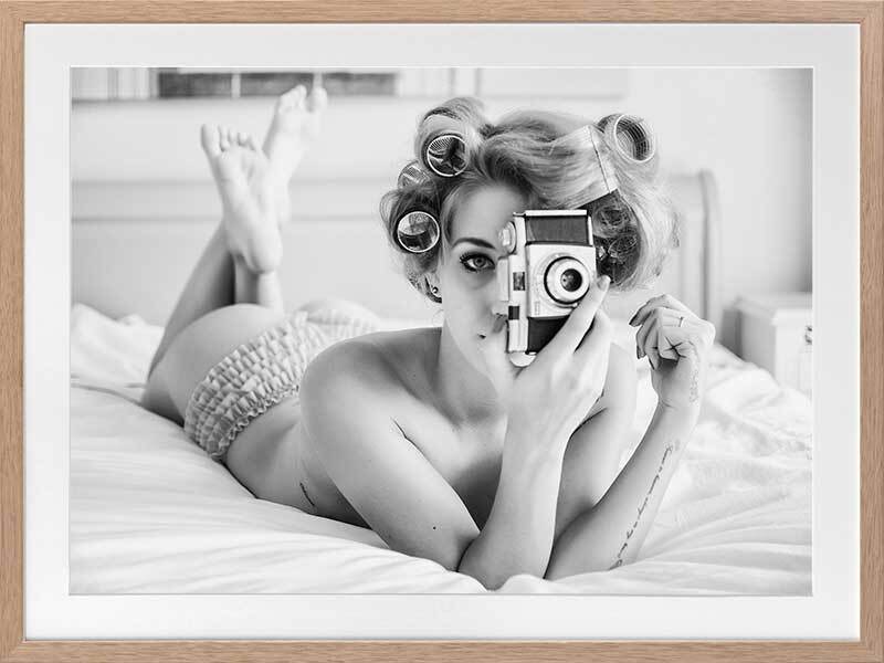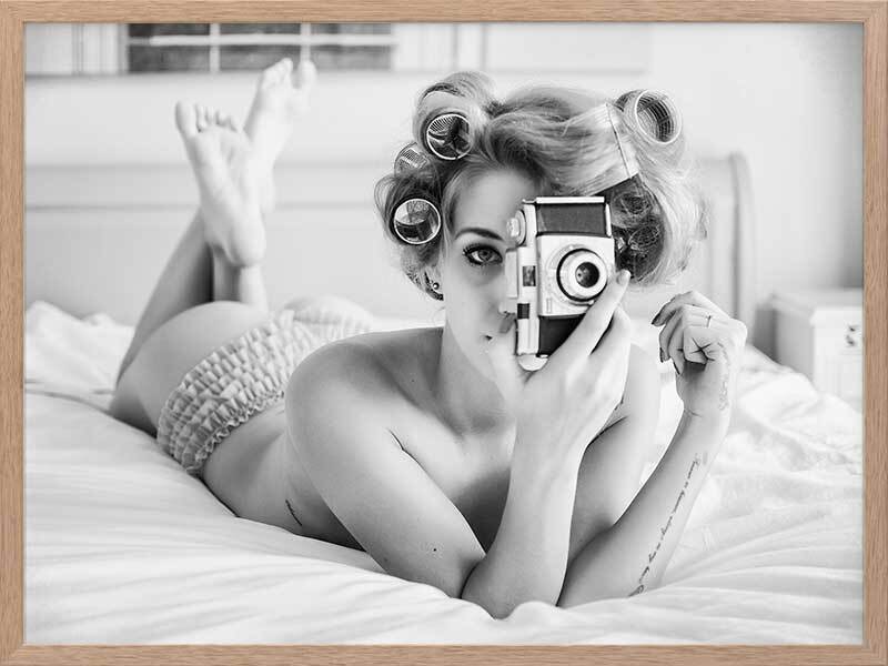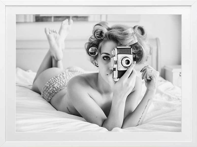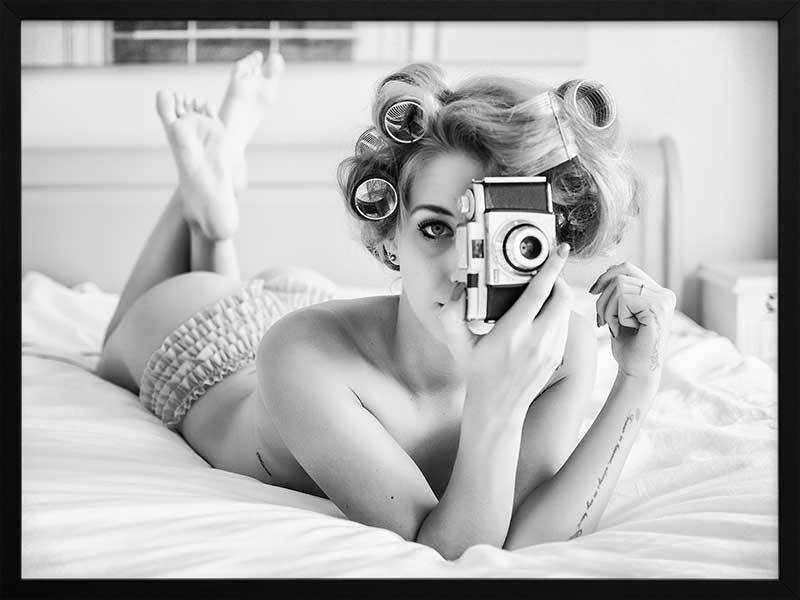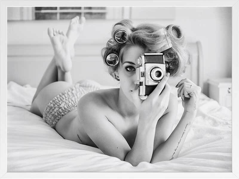 Candid Camera Framed Art Print - Feminine and cheeky, this black and white photograph features a woman with hair rollers laying on a bed holding a vintage camera.