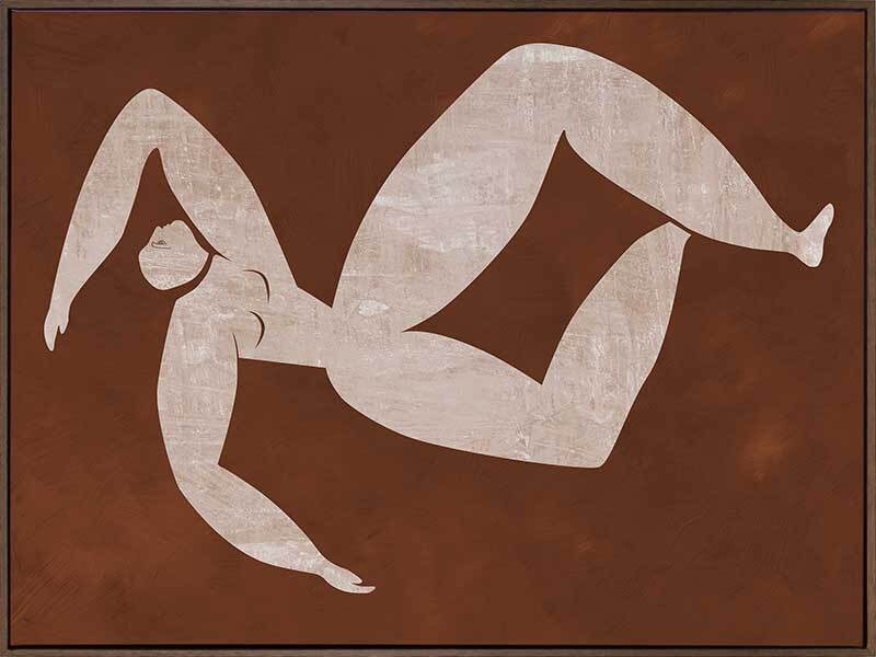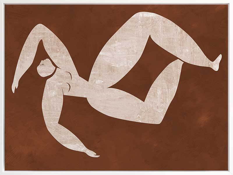 Caroline Cut-Out III Canvas Art Print - Drawing inspiration from the iconic cut-out style artwork from modern art master Matisse, this artwork features a simplistic, caricature-like portrait of a figure with exaggerated limbs. The colour palette is warm and earthy, featuring a neutral beige coloured figure against a rich brown textured background. This artwork has been created to match with Caroline Cut-Out I, II and IV.