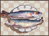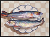 Catch of the Day Blue Canvas Art Print - Everyone loves the catch of the day. A statement still life piece featuring two freshly caught fish, placed delicately atop a porcelain plate, ready to eat. A checkerboard background gives this piece a relaxed feel, with a simple palette featuring shades of blue, beige and white.