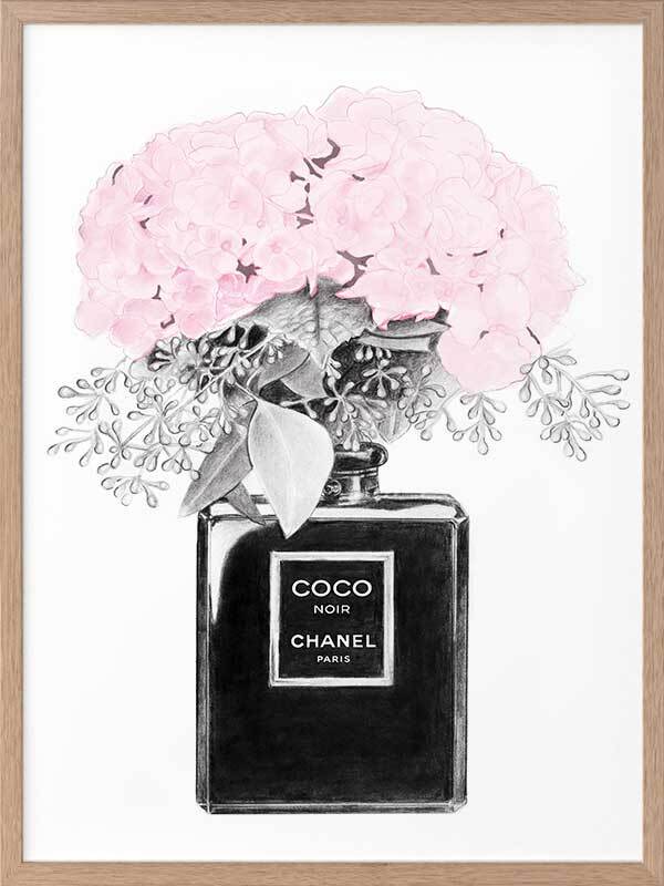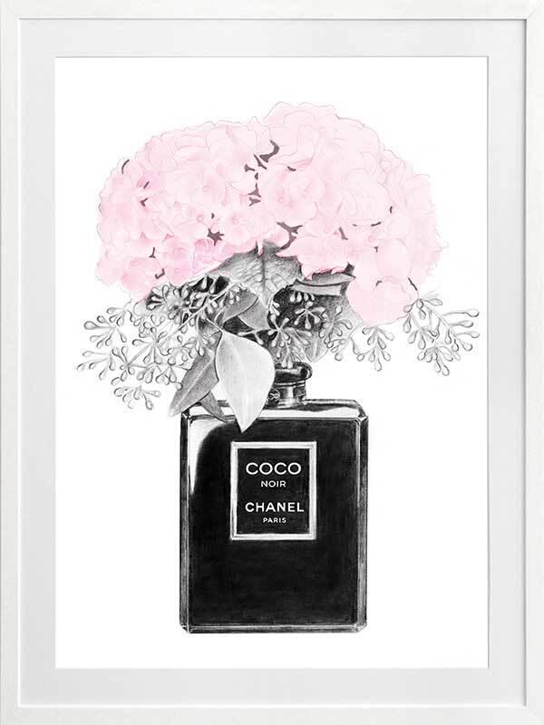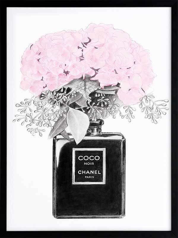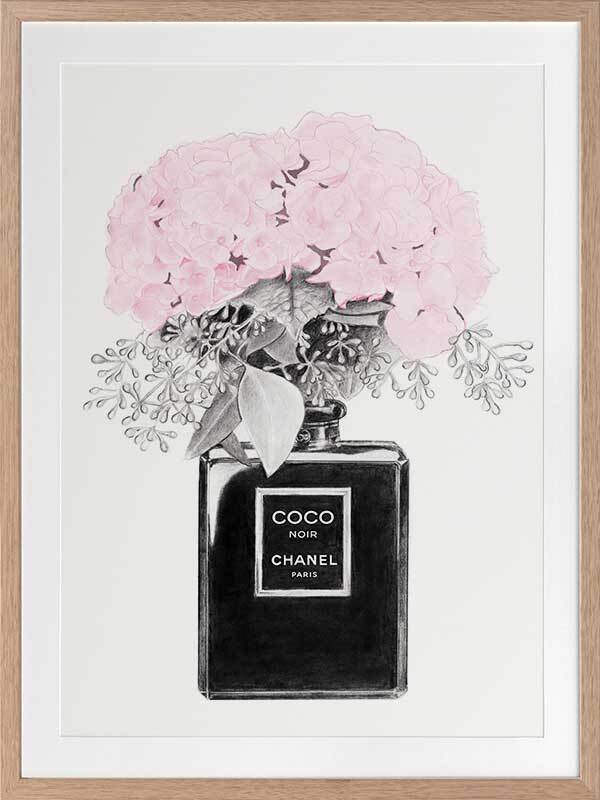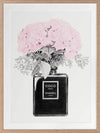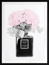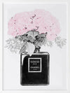 Chanel Noir Framed Art Print - What to do with your empty Chanel perfume bottles? Use them as decorative vessels, of course. This simple, yet detailed piece features a luscious bouquet, bursting to life with candy pink petals. Contrasting this bright pink shade is an understated greyscale theme, making this a versatile piece for all interior styles.