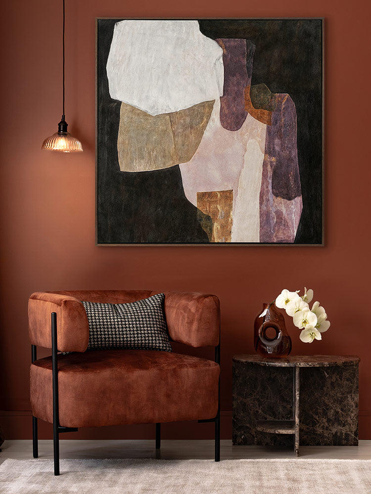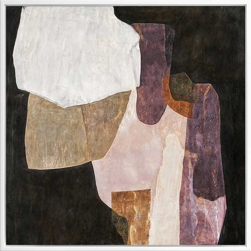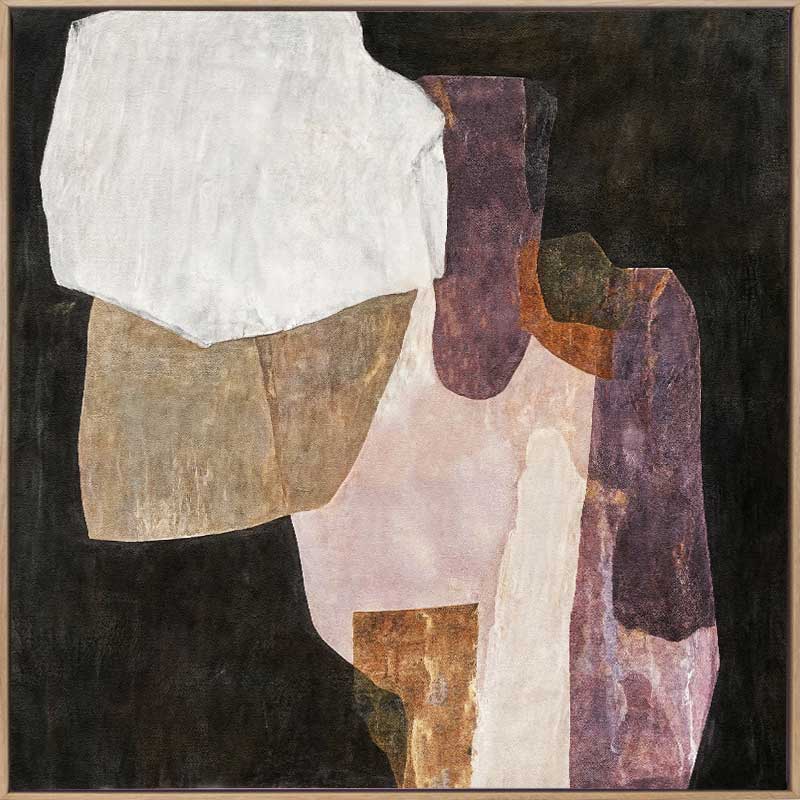 Chiaroscuro I Canvas Art Print - A quiet interplay of form and texture, this abstract wall art print layers organic shapes in warm, earthen hues. Deep browns, soft neutrals, and muted mauves unfold like weathered stone against a black backdrop, creating a composition that feels both grounded and ethereal. Bold yet understated, it brings a sense of balance and depth to any space.