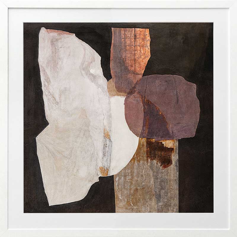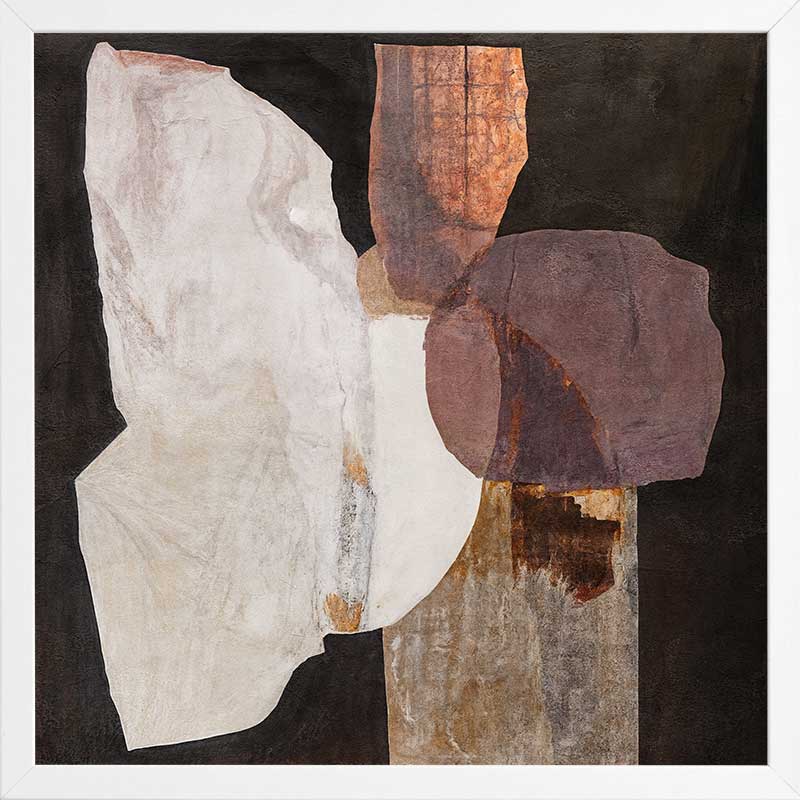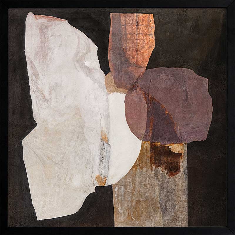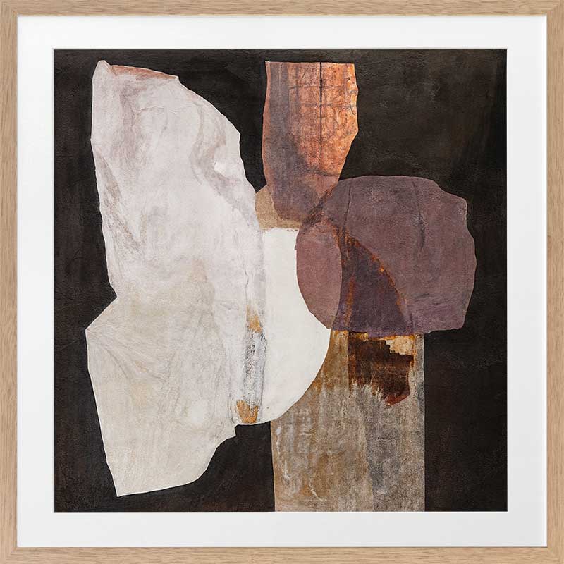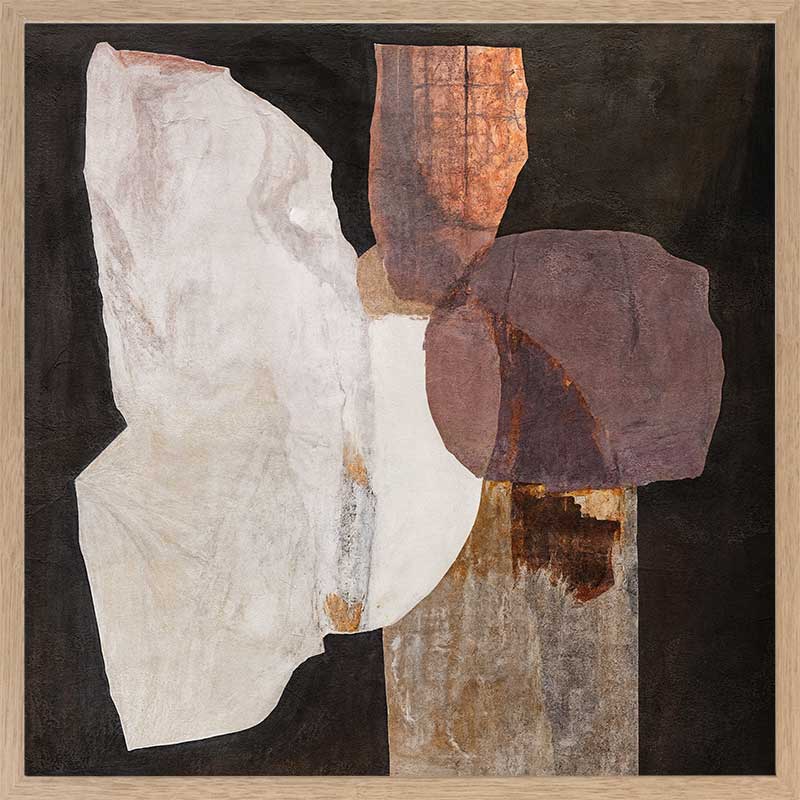 Chiaroscuro II Framed Art Print - A quiet interplay of form and texture, this abstract wall art print layers organic shapes in warm, earthen hues. Deep browns, soft neutrals, and muted mauves unfold like weathered stone against a black backdrop, creating a composition that feels both grounded and ethereal. Bold yet understated, it brings a sense of balance and depth to any space.