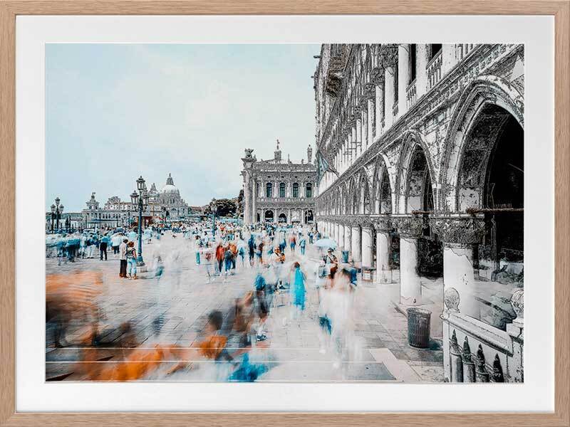 Ciao Venezia Framed Art Print - A blurred photograph of a busy Piazza San Marco in Venice with pops of blue and orange. THE CURATED SERIES A handpicked gallery of daringly quirky photographic pieces exploding with richness of colour and texture.