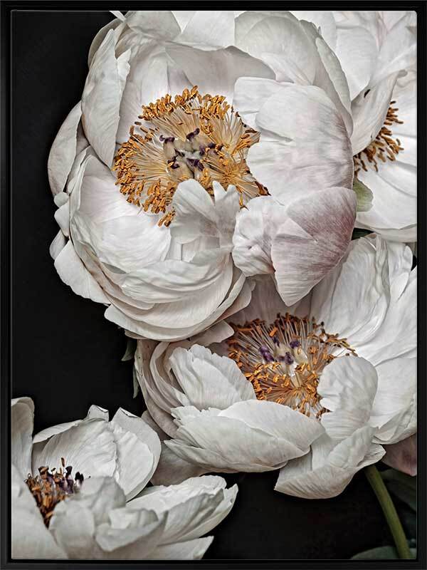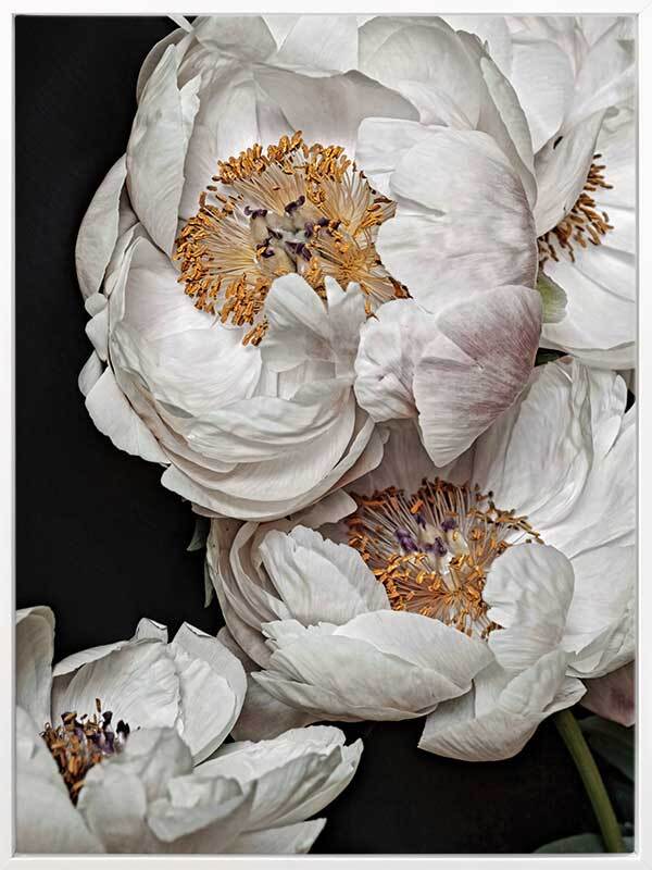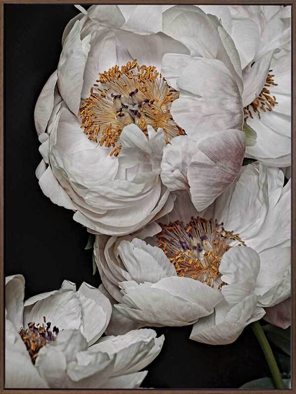 Clair de Lune Canvas Art Print: A striking photographic print featuring a group of soft, cream and pink coloured peonies contrasted against a dark background. Pairs with Ivory Atlas. 2019 AUTUMN/WINTER COLLECTION: ODYSSEY