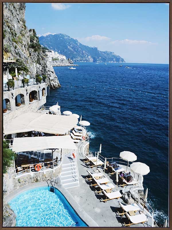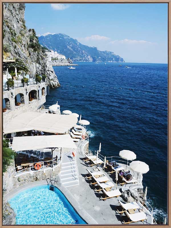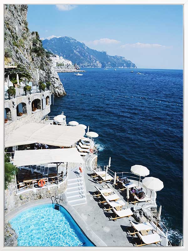 Cliffs of Capri - A vibrant photograph of an Italian cliffside resort, featuring a wide blue sea and a stunning view of the distant cliffs.