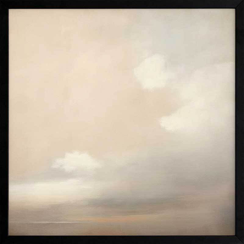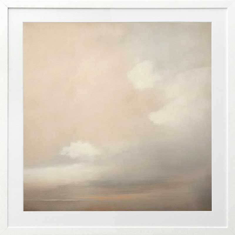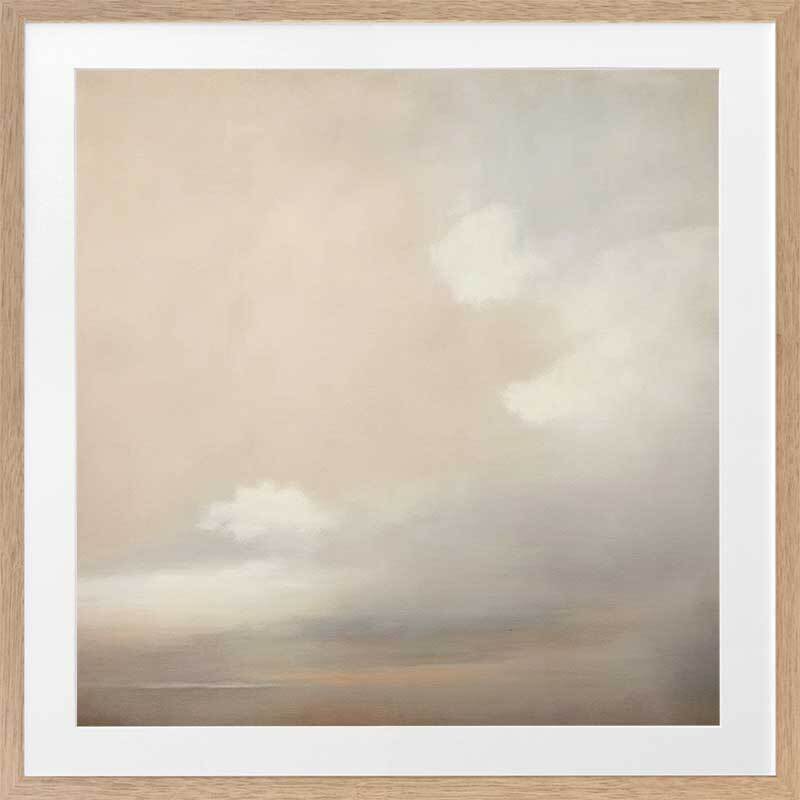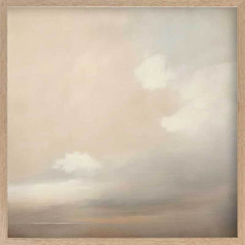 Cloud Ballet Framed Art Print - Watch in awe as the clouds waltz across the hazy sky, where an interplay of soft white and gentle beige tones evoke a sense of peace and tranquillity. This minimalist style wall art offers a soothing visual experience, a poignant reminder of the simple beauty that surrounds us.