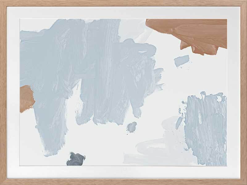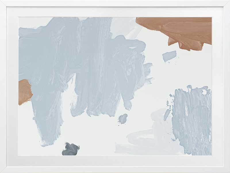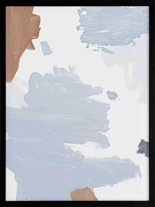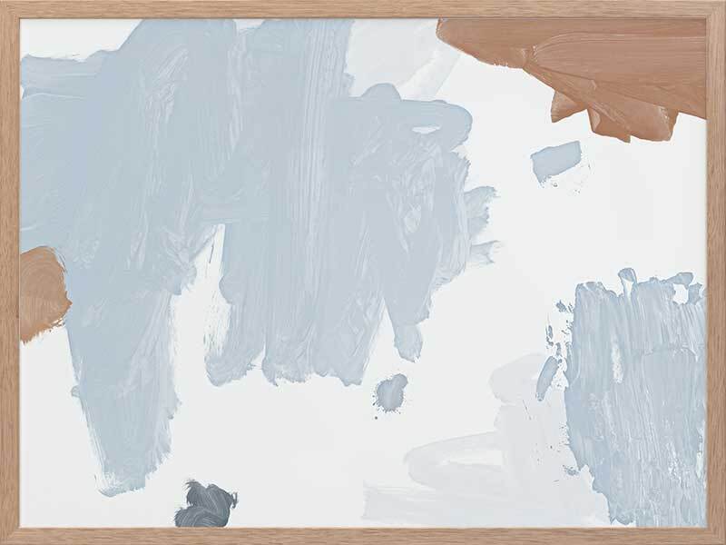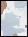 Cloudy Framed Art Print - An abstract take on a cloudy skyscape, this piece brings a soft, mellow feel to any room with its use of muted blue messy brush strokes, against a light grey background, with hints of warm brown to balance it all out.