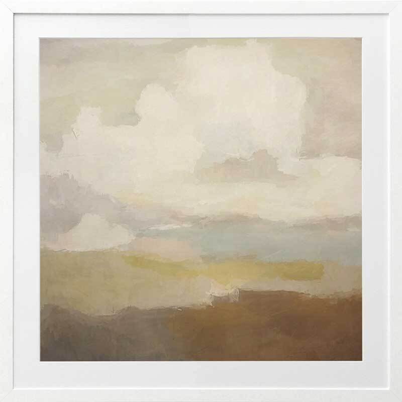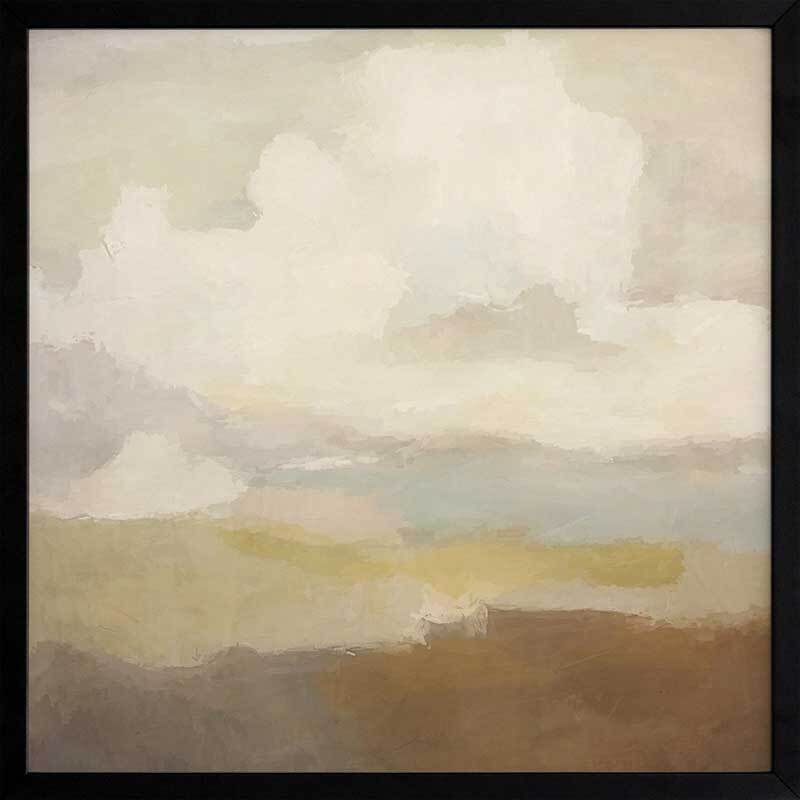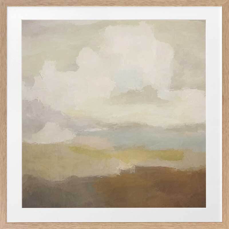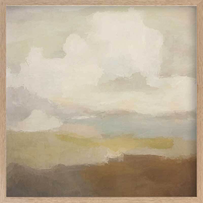 Cloudy Serenades Framed Art Print - A visual symphony of elegance, this wall art brings clouds to life with delicate brush strokes that make them dance and swirl, evoking a soft, calming energy. Palette includes soft beige, warm brown, and a touch of blue, making it a neutral artwork versatile for any space.