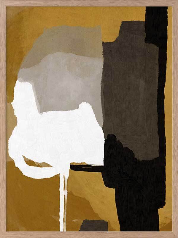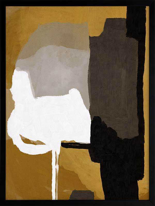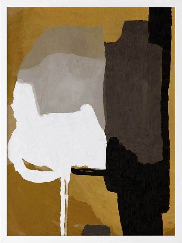 Clue Framed Art Print - A warm, masculine, abstract artwork that layers blocks of painted colours and textures. The palette is dark and restrained, featuring white, black, brown and grey tones.