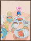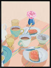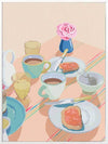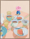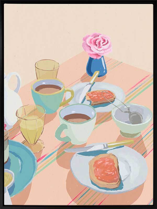 Coffee & Marmalade Canvas Art Print - Calm and relaxed, this painterly artwork of coffee and marmalade sits on top of delicate chinas on a peach table cloth with vertical rainbow stripes and is complemented by a freshly picked rose from the garden. Tangerine tone marmalades are spread over toasts and are in contrast with dark and mint green coffee mugs set against a nude background.