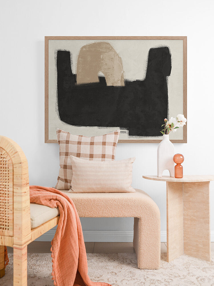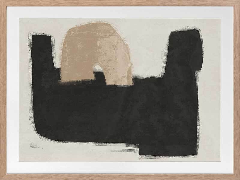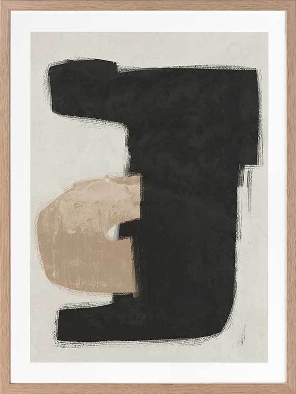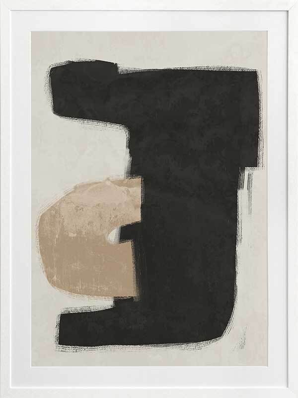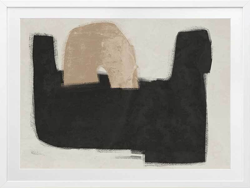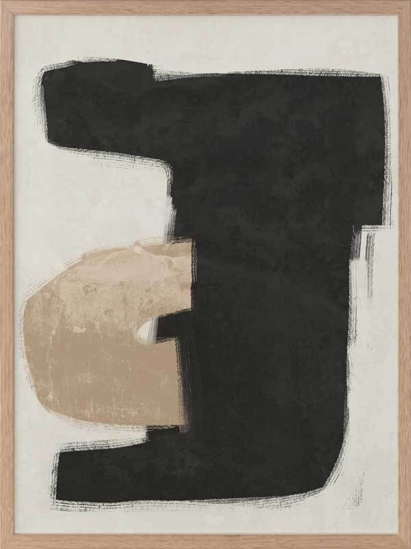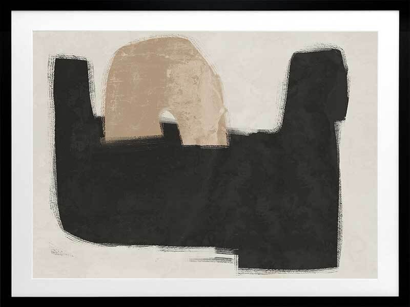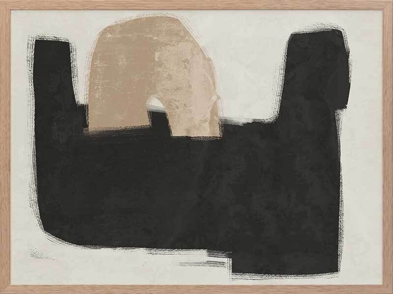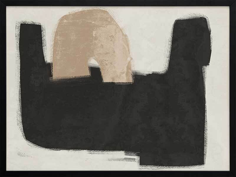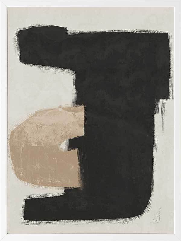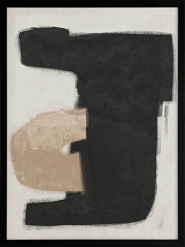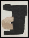 Composed Black Framed Art Print - This minimalistic abstract artwork uses curves and other odd shapes and angles to create a cohesive feel, using visible brush strokes for an organic look. With a simple, clean palette of tan, black, and light beige, this piece brings a calming air to your space with a little moodiness for added character.