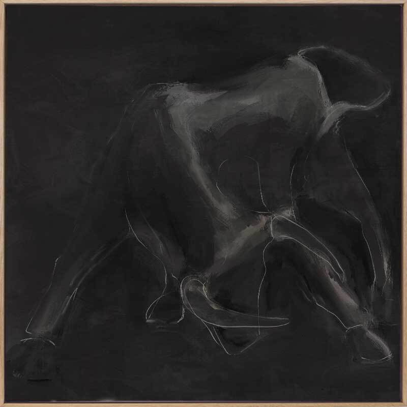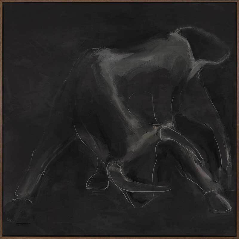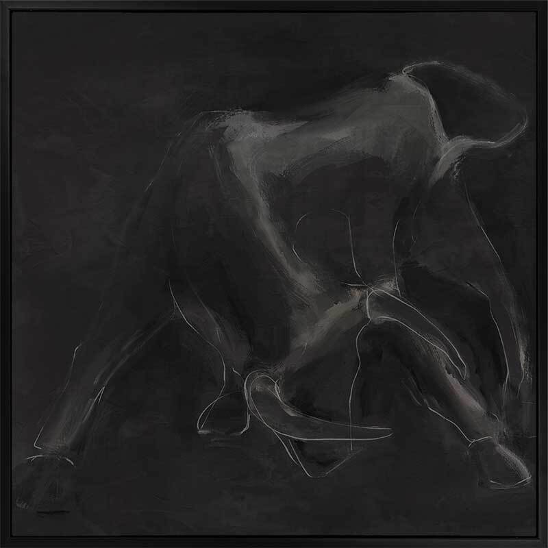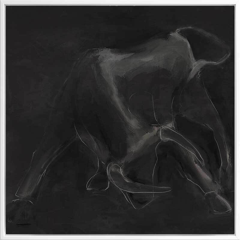 Contours Charge Canvas Art Print - "Contours Charge" commands attention with its sense of masculine elegance. Inspired by the contours of a charging bull, this piece is an integral part of this masculine art collection by Darren Palmer, bringing to life the raw power of the bull, yet appreciating its softness and beauty. Using light grey outlines against a dark charcoal background, each bold line and abstract smudge plays on minimalist simplicity, making a striking impact, where you're invited to engage with the essence of strength and motion suspended in time.