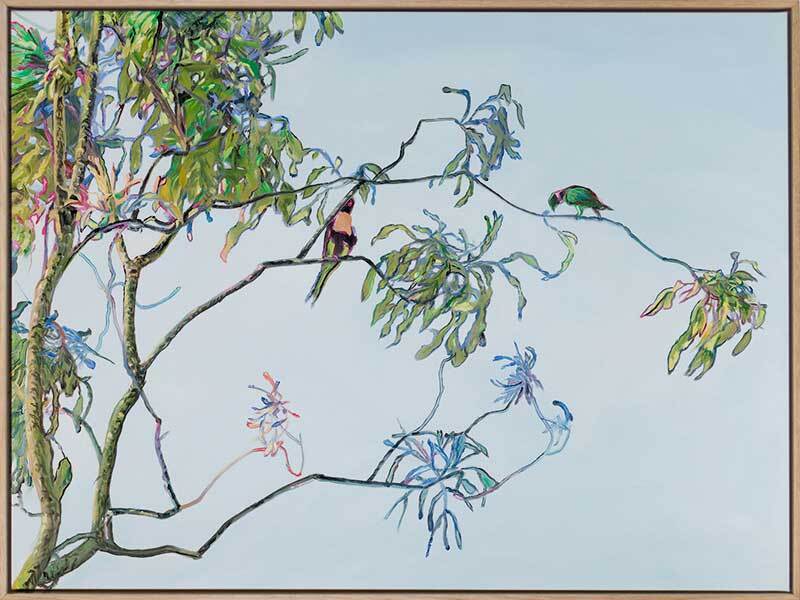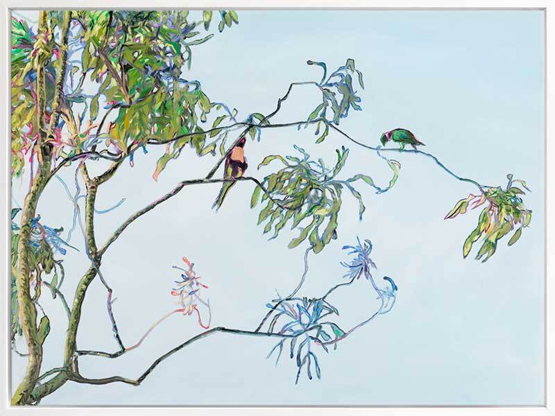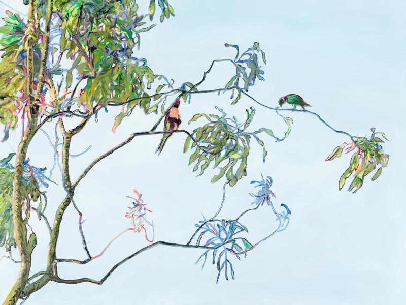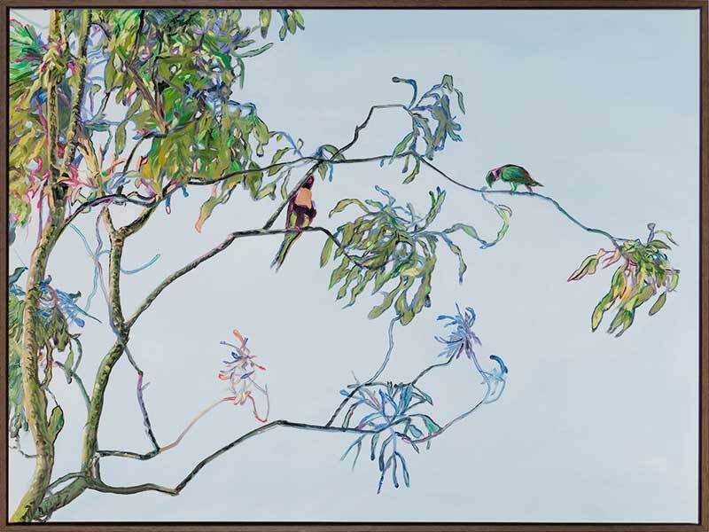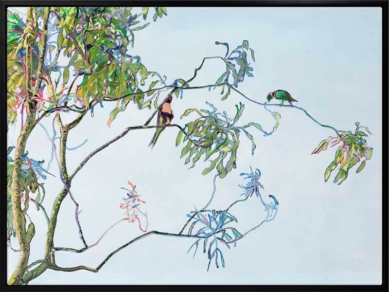 Coolibah Canvas Art Print: A beautifully detailed print of an oil-painted gum tree on a soft blue background with brightly coloured Australian birds. 2018 SPRING/SUMMER COLLECTION: REMINISCE