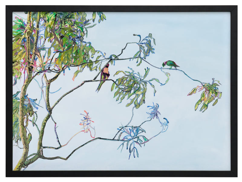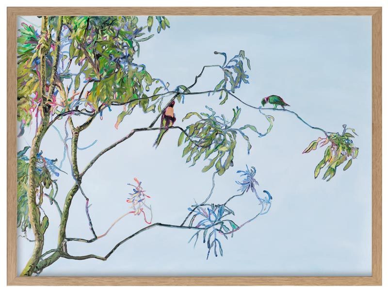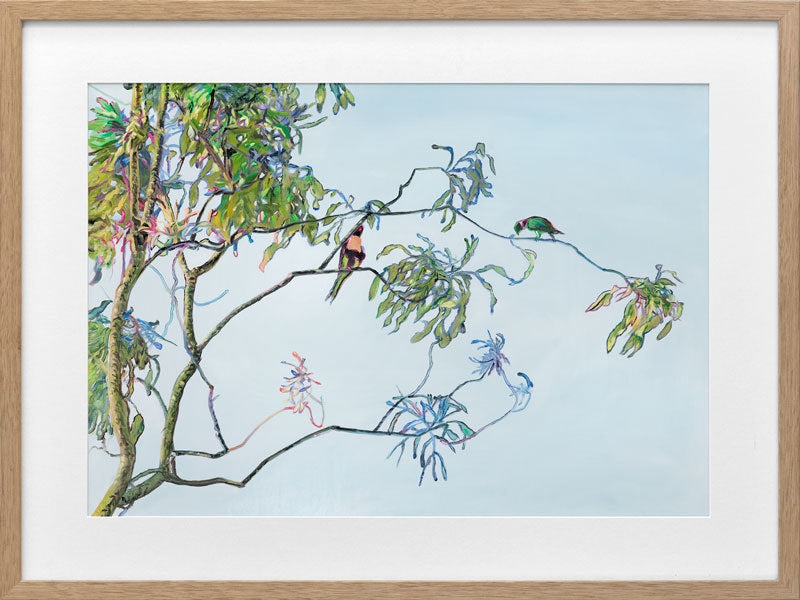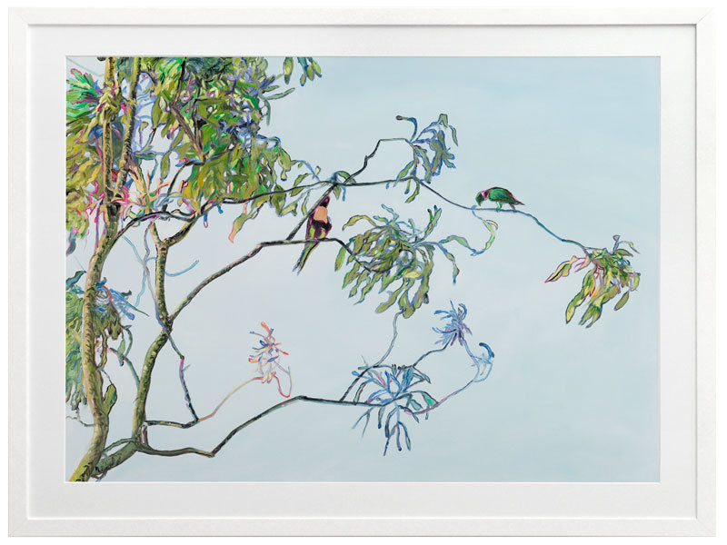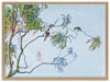 Coolibah Framed Print: A beautifully detailed print of an oil-painted gum tree on a soft blue background with brightly coloured Australian birds. 2018 SPRING/SUMMER COLLECTION: REMINISCE