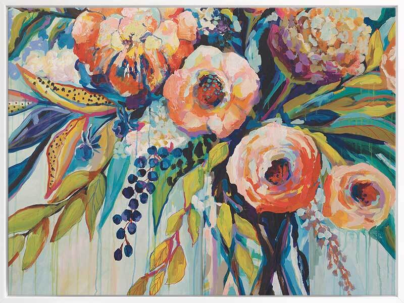 Coral Kiss Canvas Art Print - An explosion of colour breathes a fresh energy into any space with this gorgeous still life of a fresh bouquet of flowers and greenery. Using creamy orange shades, soft greens, rich purples, and soft blue tones carried throughout, warm up your walls with this exciting burst of colour.