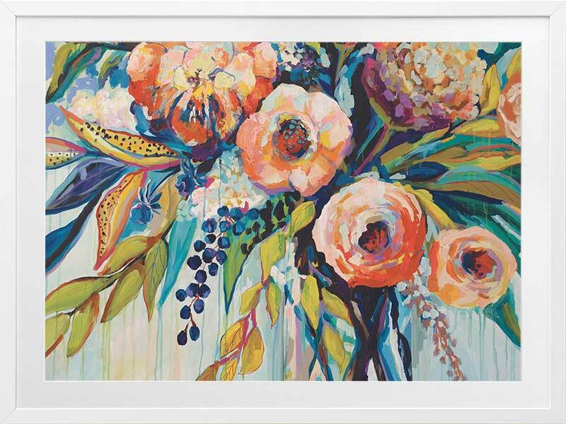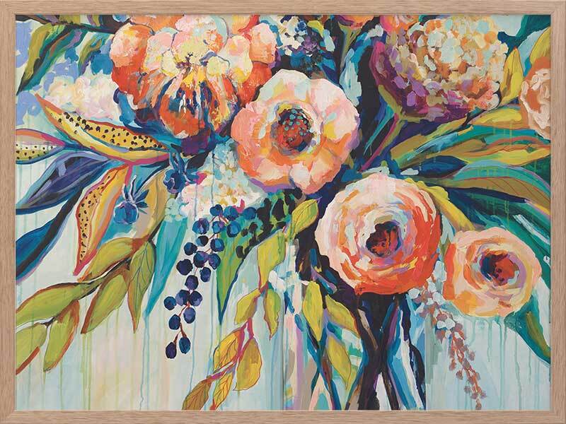 Coral Kiss Framed Art Print - An explosion of colour breathes a fresh energy into any space with this gorgeous still life of a fresh bouquet of flowers and greenery. Using creamy orange shades, soft greens, rich purples, and soft blue tones carried throughout, warm up your walls with this exciting burst of colour.