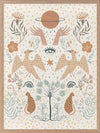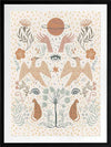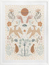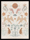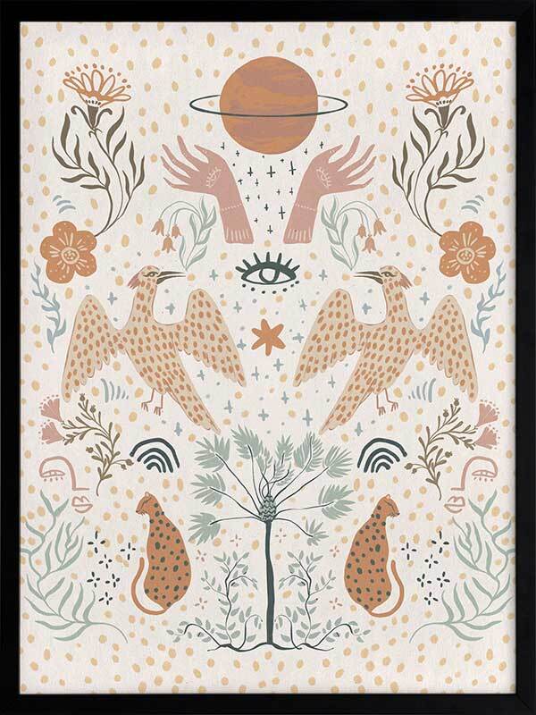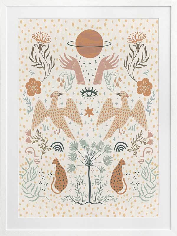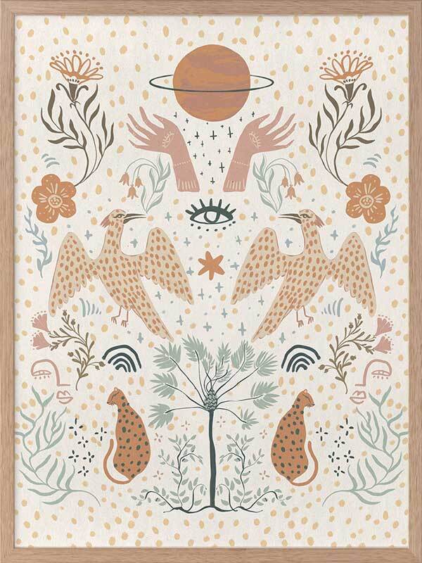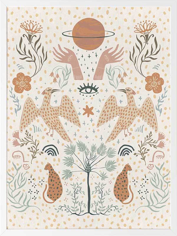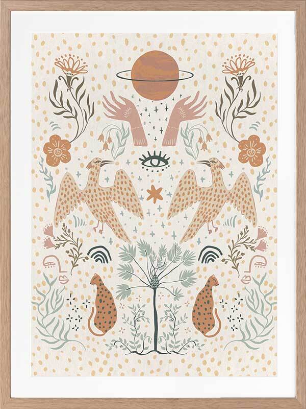 Cosmic Creatures Framed Art Print - Playful and ethereal, this bohemian inspired artwork features an eclectic array of illustrations, including leopards, birds, botanicals and celestial elements. The colour palette contrasts soft pastel greens, pinks and blues against warm mustard yellow.