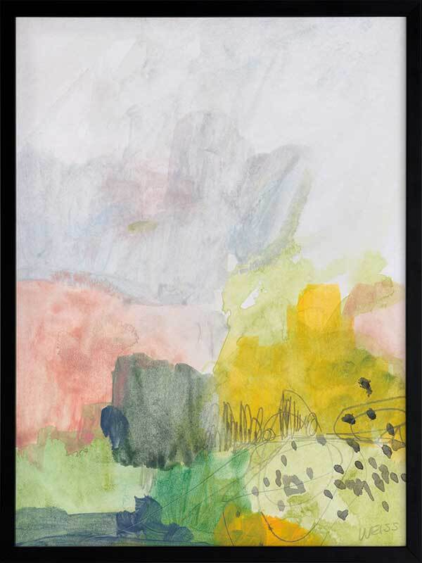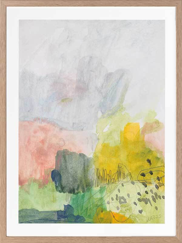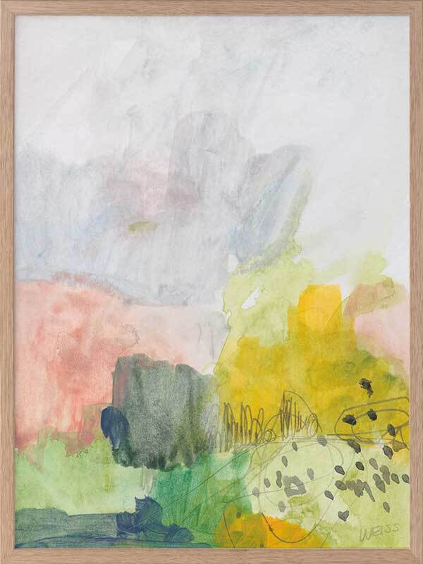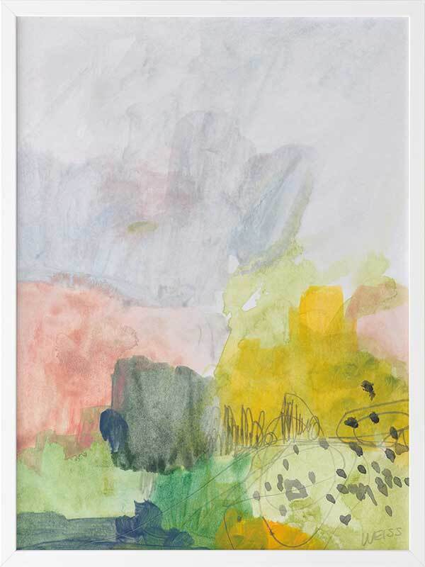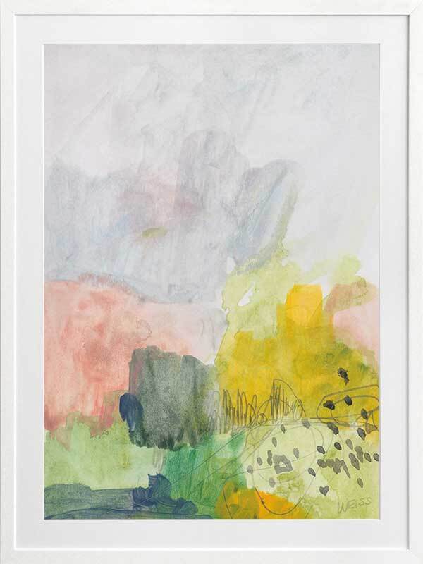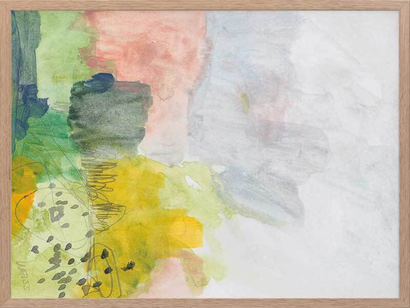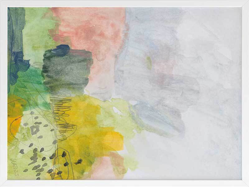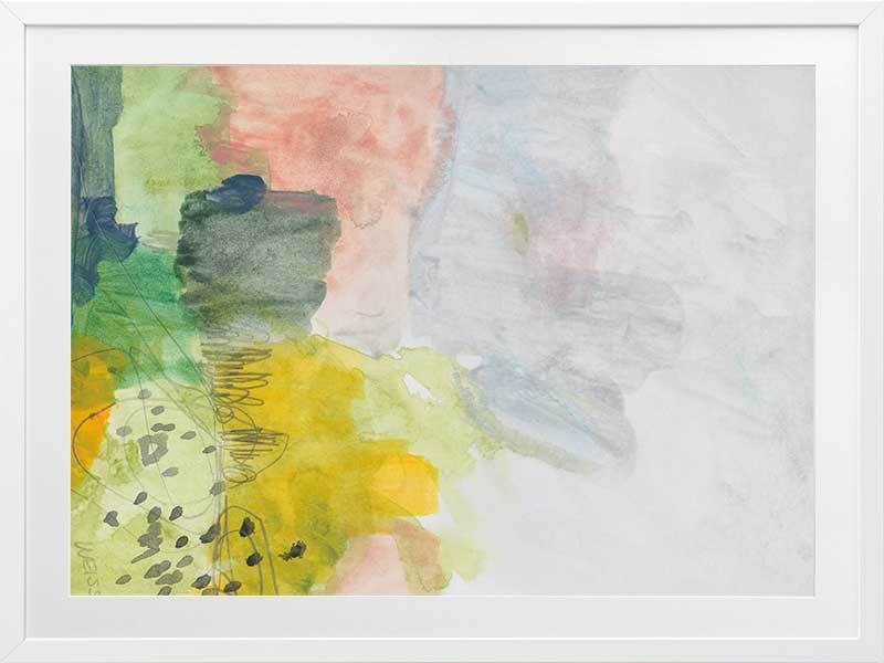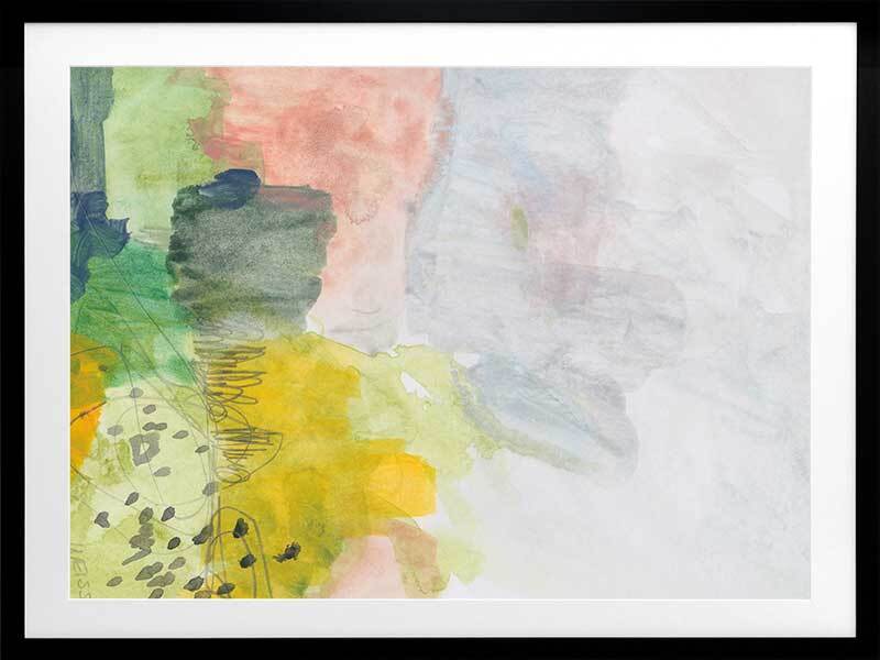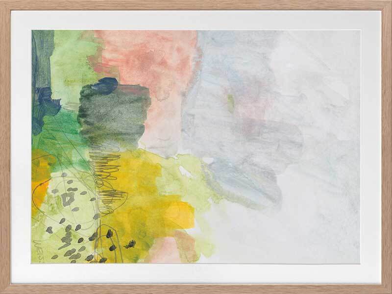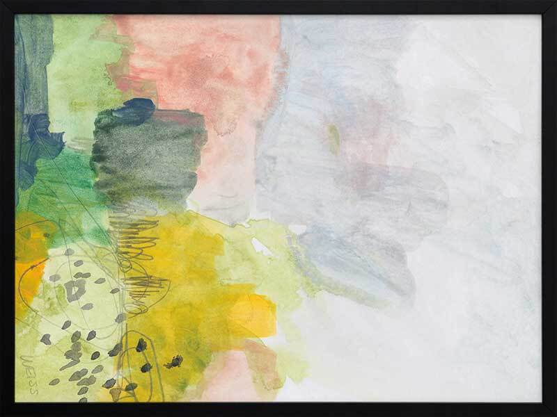 Cotton Candy I Framed Art Print - A subtle colour palette with abstract shapes, brush strokes, spots, and lines, this piece brings a soft energy to your space. Colour palette includes pastel tones of yellow, pink, green, and blue.