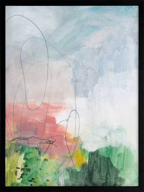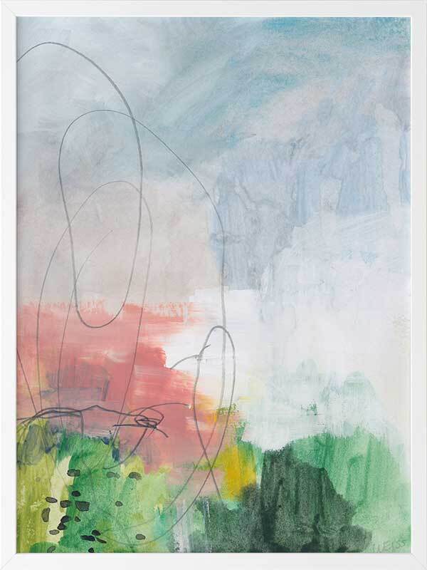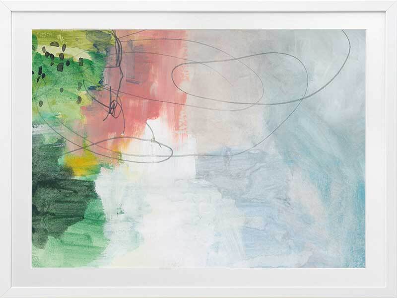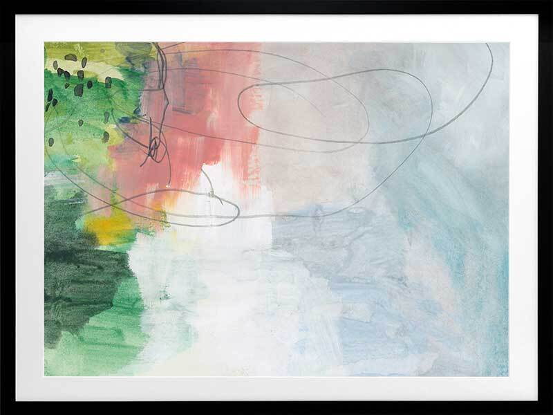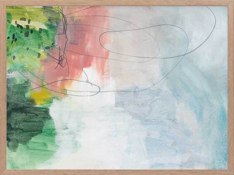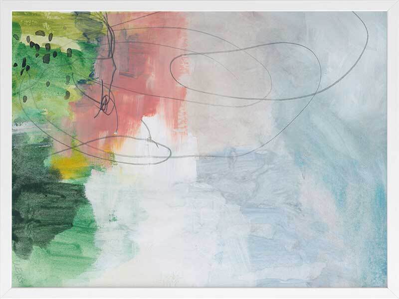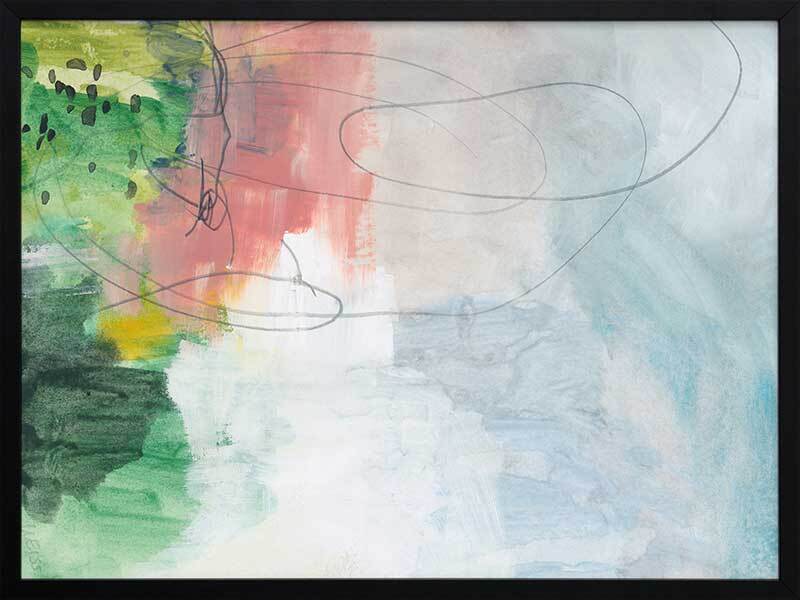 Cotton Candy II Framed Art Print - A subtle colour palette with abstract shapes, brush strokes, spots, and lines, this piece brings a soft energy to your space. Colour palette includes pastel tones of yellow, pink, green, and blue.