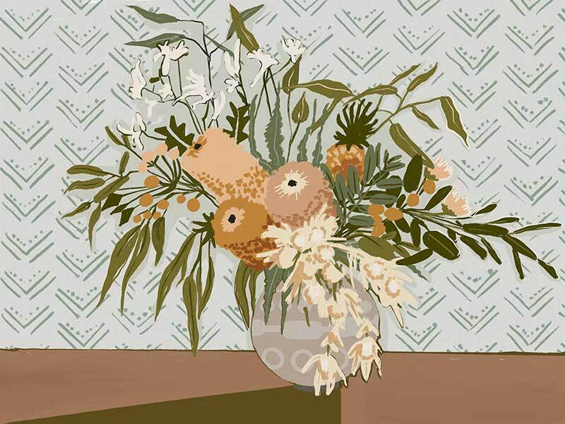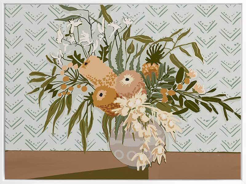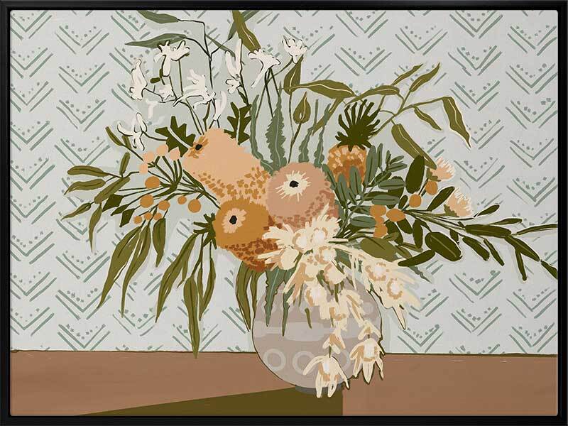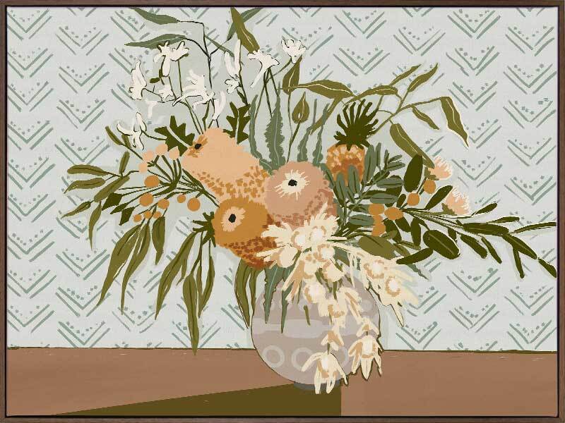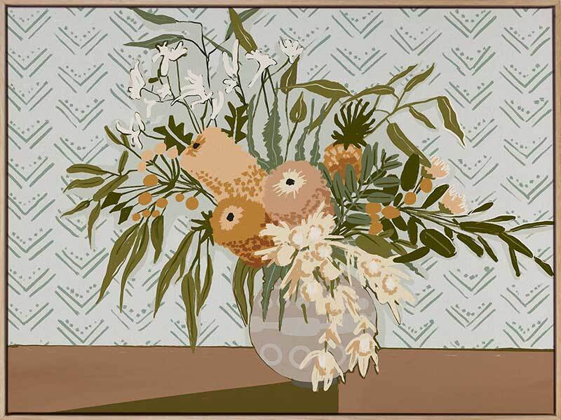 Country's Finest Canvas Art Print - Earthy, fresh and grounded, this painterly style still life artwork features a vase full of wild Australian Natives, including banksia, lilly pilly, kangaroo paw and gum leaves. The colour palette is warm and muted, featuring warm, olive and khaki green foliage and golden brown flora against a powder blue background.
