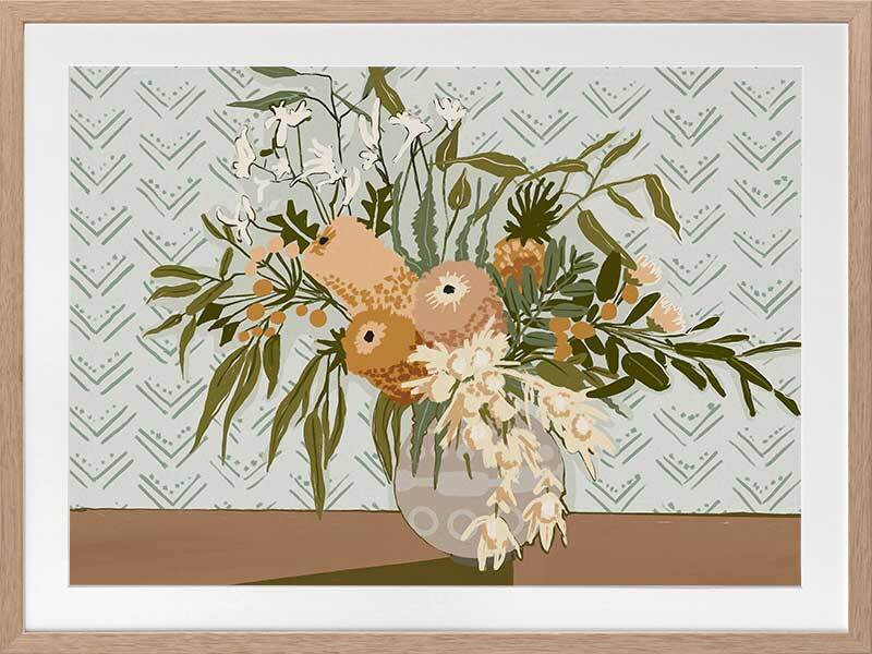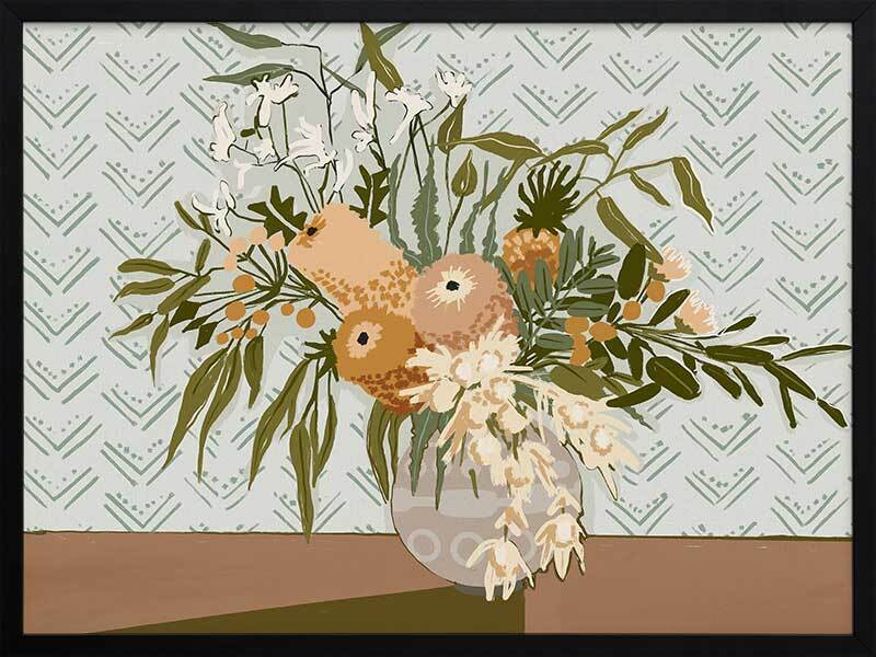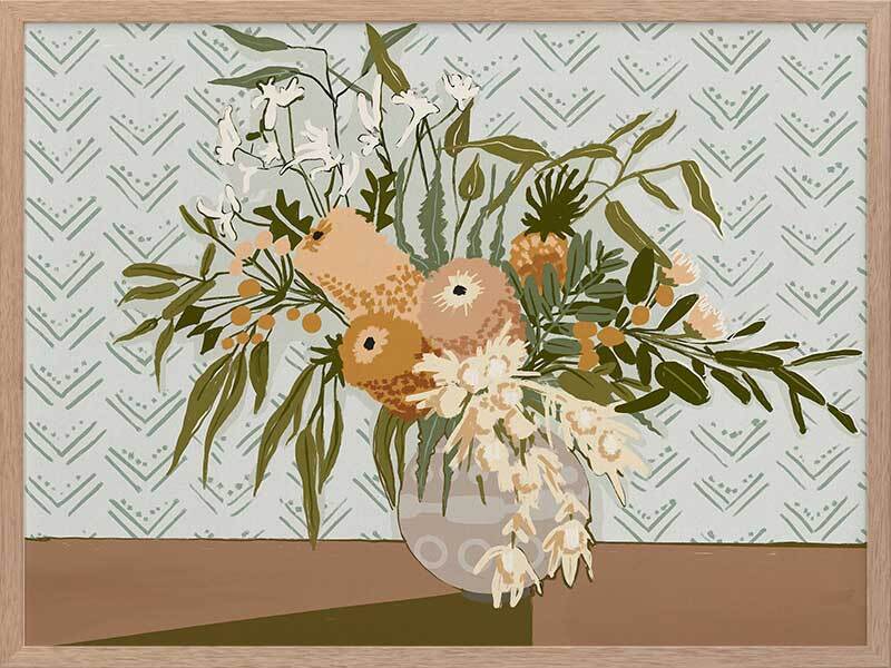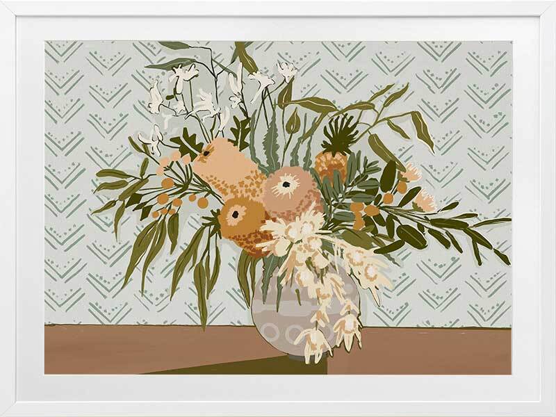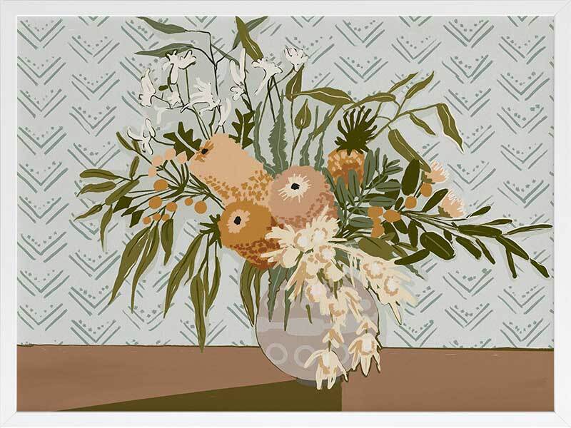 Country's Finest Framed Art Print - Earthy, fresh and grounded, this painterly style still life artwork features a vase full of wild Australian Natives, including banksia, lilly pilly, kangaroo paw and gum leaves. The colour palette is warm and muted, featuring warm, olive and khaki green foliage and golden brown flora against a powder blue background.