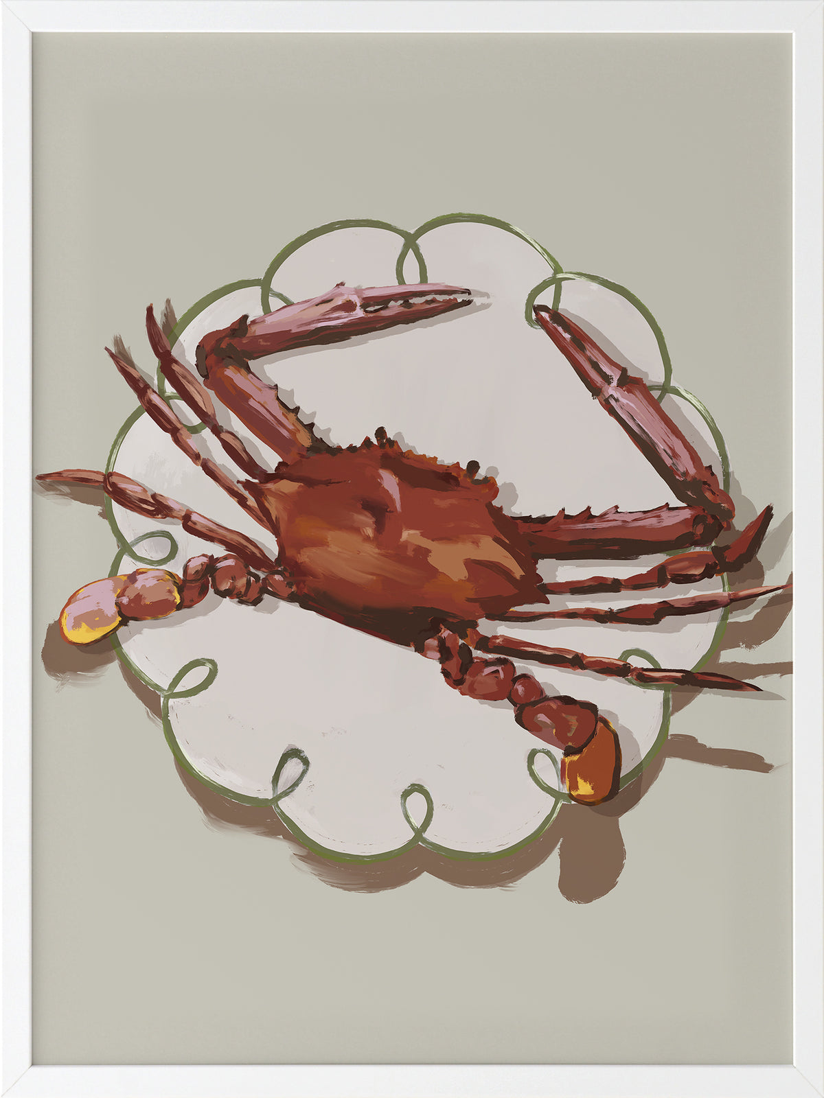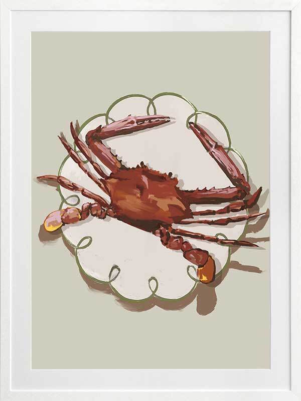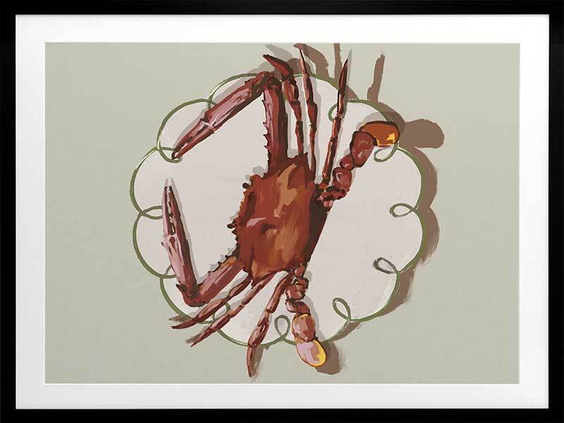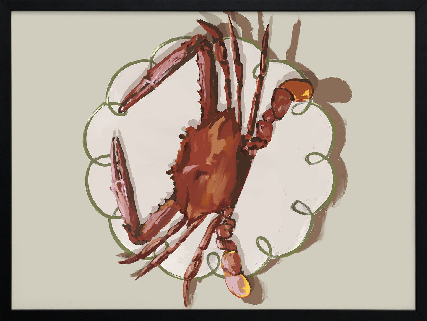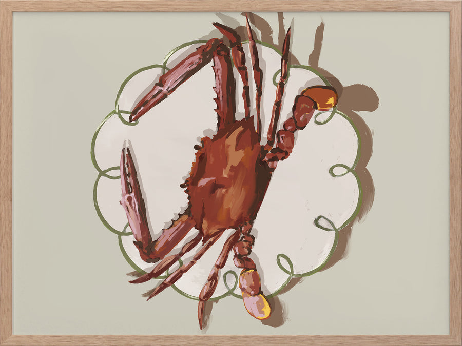 Crustacean Beige Framed Art Print - Freshly caught, this crustacean is ready to be served. A still life study of a sea-dwelling crab, this piece blends a simple background with detailed imagery in the foreground, giving it an abstract painterly feel, with a simple palette featuring beige, white, and shades of orange and red. Perfect for any kitchen or living space.