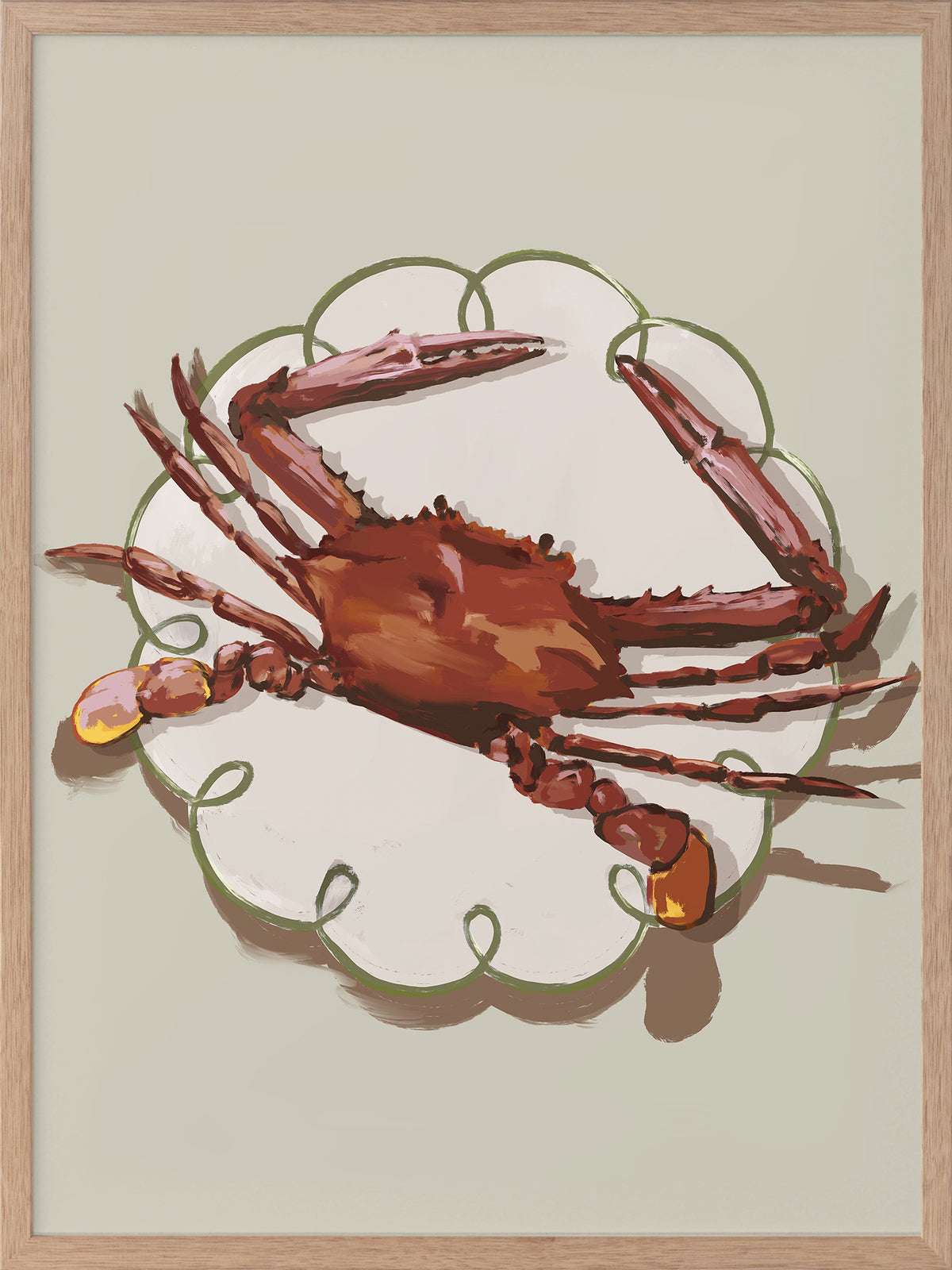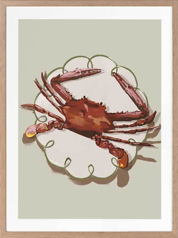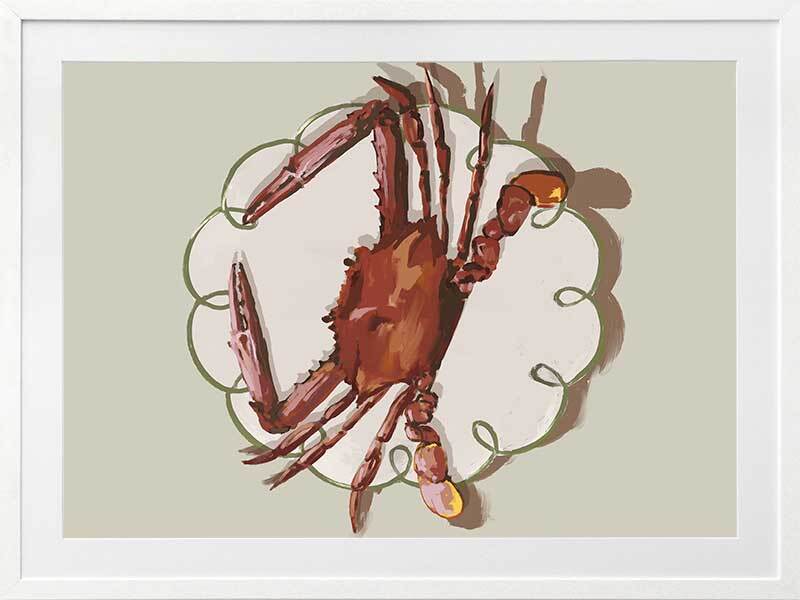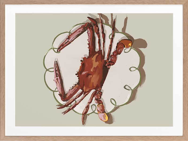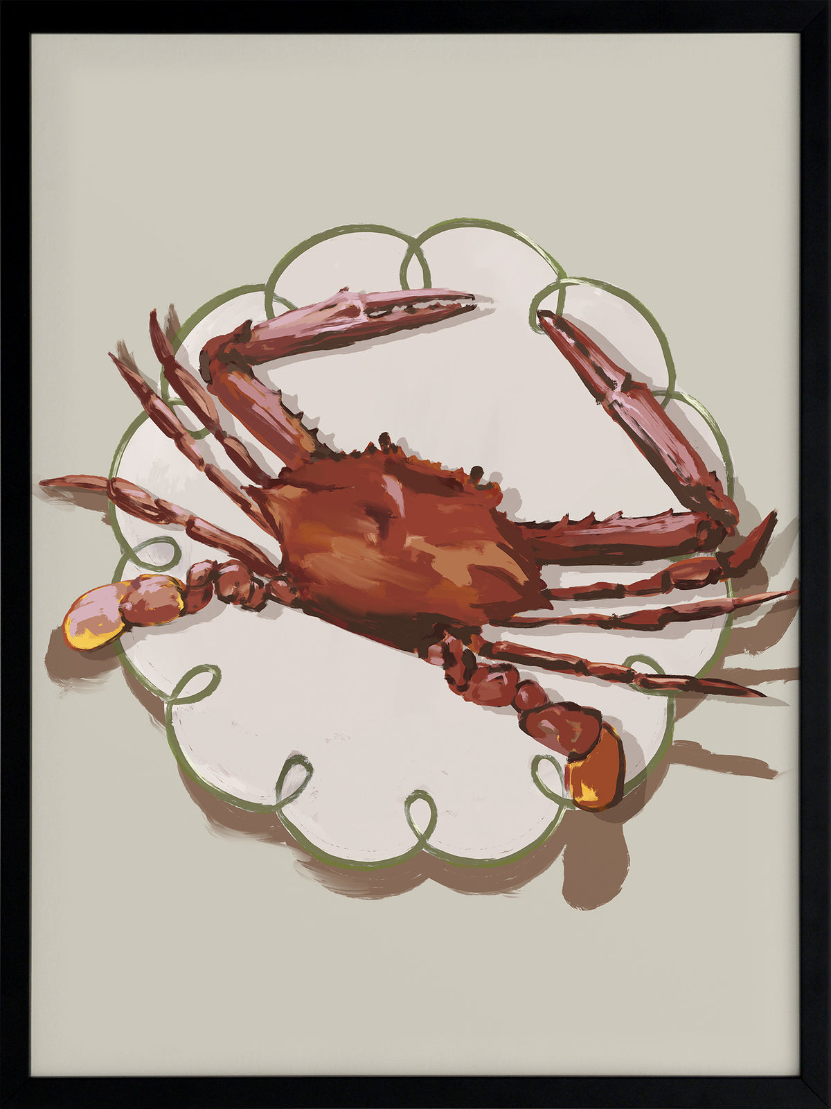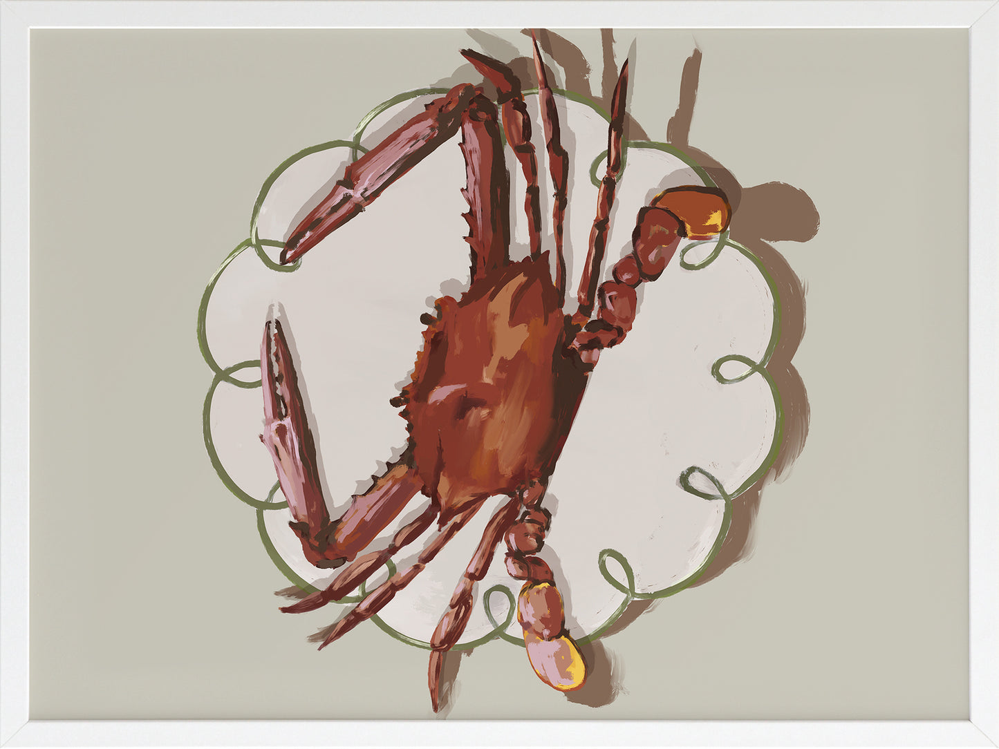 Crustacean Beige Framed Art Print - Freshly caught, this crustacean is ready to be served. A still life study of a sea-dwelling crab, this piece blends a simple background with detailed imagery in the foreground, giving it an abstract painterly feel, with a simple palette featuring beige, white, and shades of orange and red. Perfect for any kitchen or living space.
