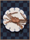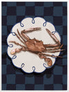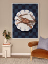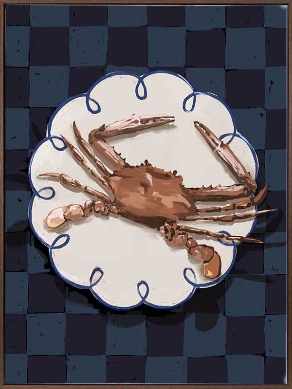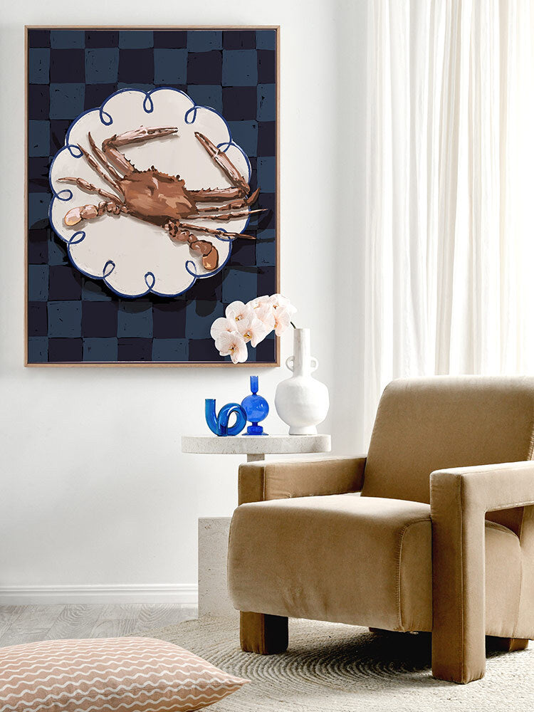 Crustacean Deep Blue Canvas Art Print - Freshly caught, this crustacean is ready to be served. A still life study of a sea-dwelling crab, this piece blends a simple checkerboard background with detailed imagery in the foreground, giving it an abstract painterly feel, with a simple palette featuring deep blue tones, white, and reddish-brown shades. Perfect for any kitchen or living space.