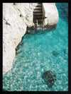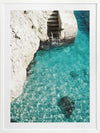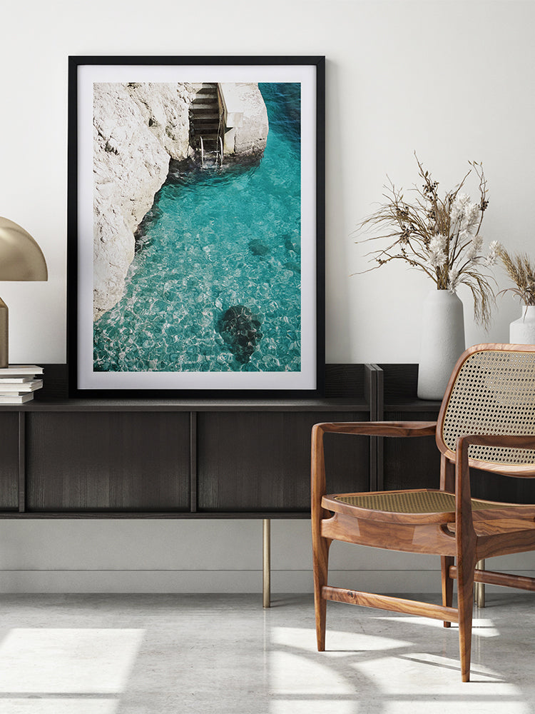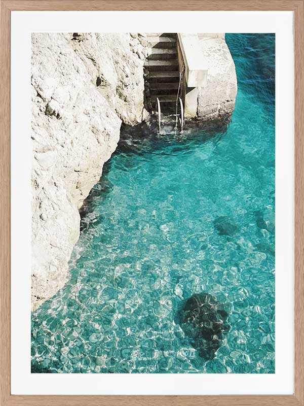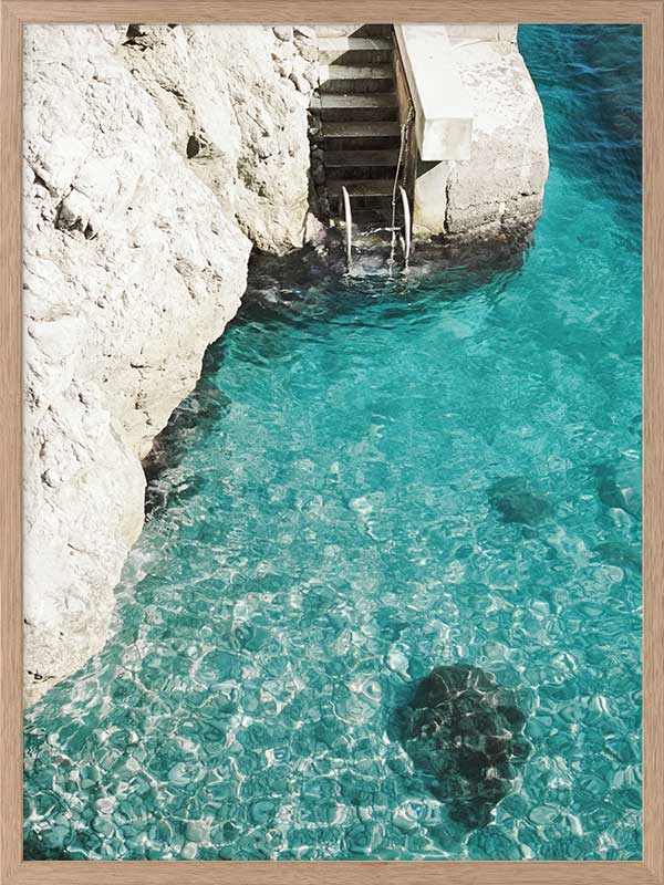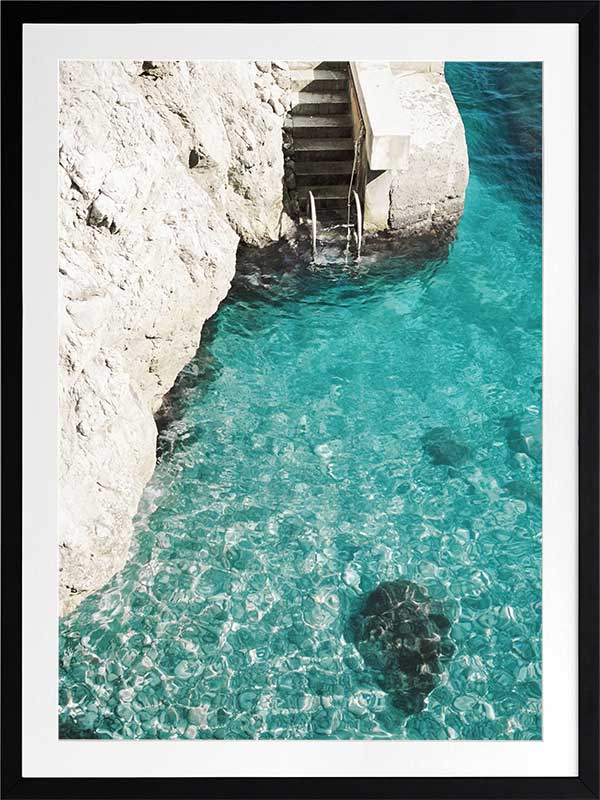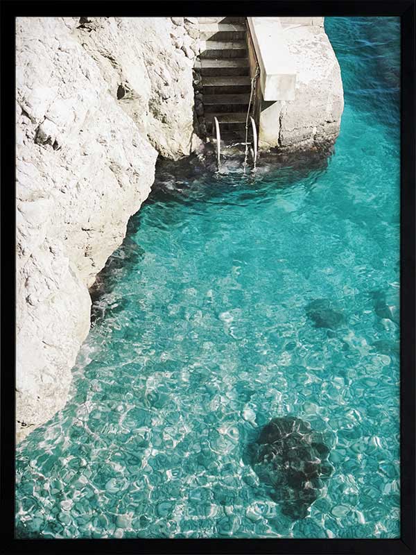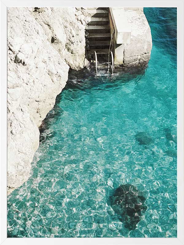 Crystal Clear - A rocky staircase leads down the rocky cliff into vibrant, clear turquoise water in this striking photographic artwork.
