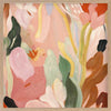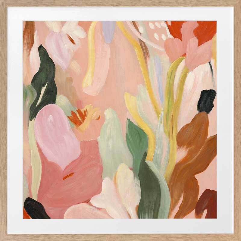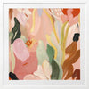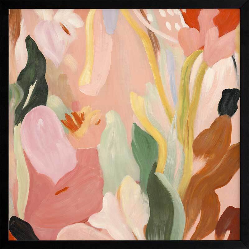 Dancing Petals Framed Art Print - Immerse your space in the warm, playful melodies of these dancing flowers. This abstract artwork is a symphony of movement, with strokes of pink, coral, and sage shaping an abstract garden in bloom.