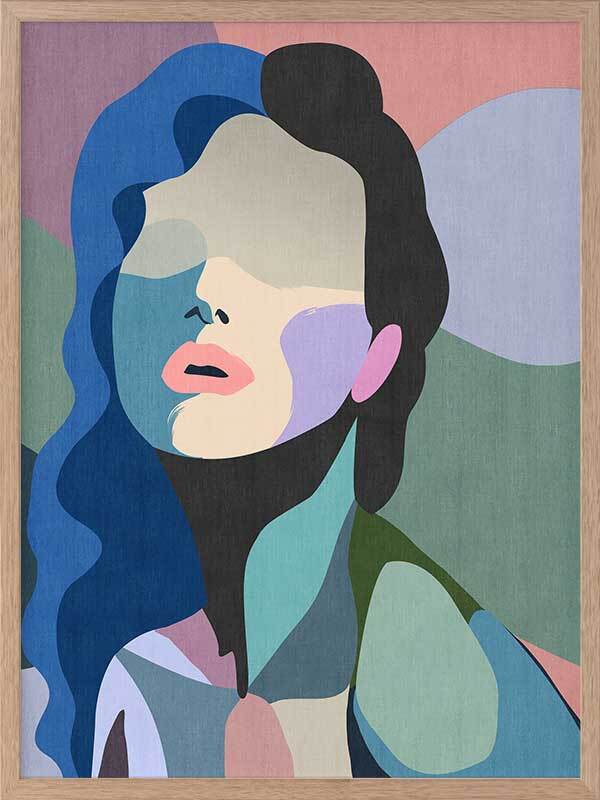 Daring Framed Art Print - This pop art style abstract portraiture features a mosaic array of colourful geometric shapes forming the face of a woman. The palette is bold and vibrant with pops of teal, blue, peach and lilac shades.