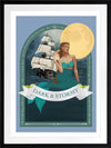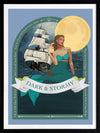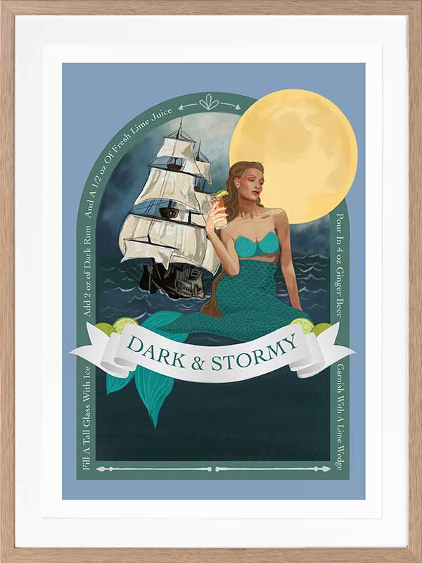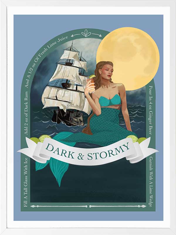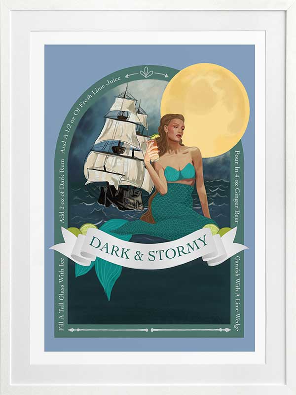 Dark and Stormy - A whimsical, fashion style illustration featuring a mermaid and a tall ship - a quirky pictograph of a Dark and Stormy Cocktail. The colour palette is cool and fresh, featuring teal, blue and a pop of pale yellow.