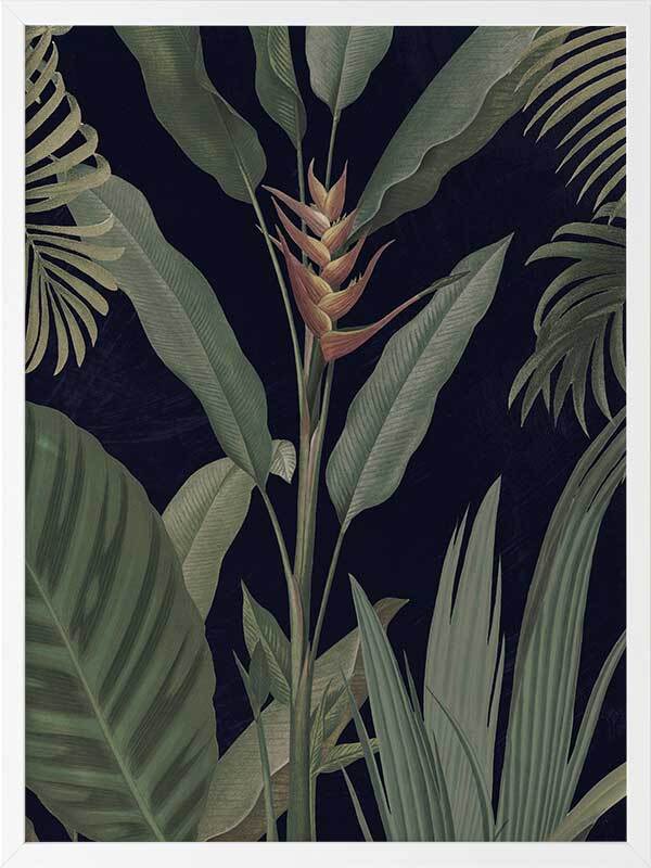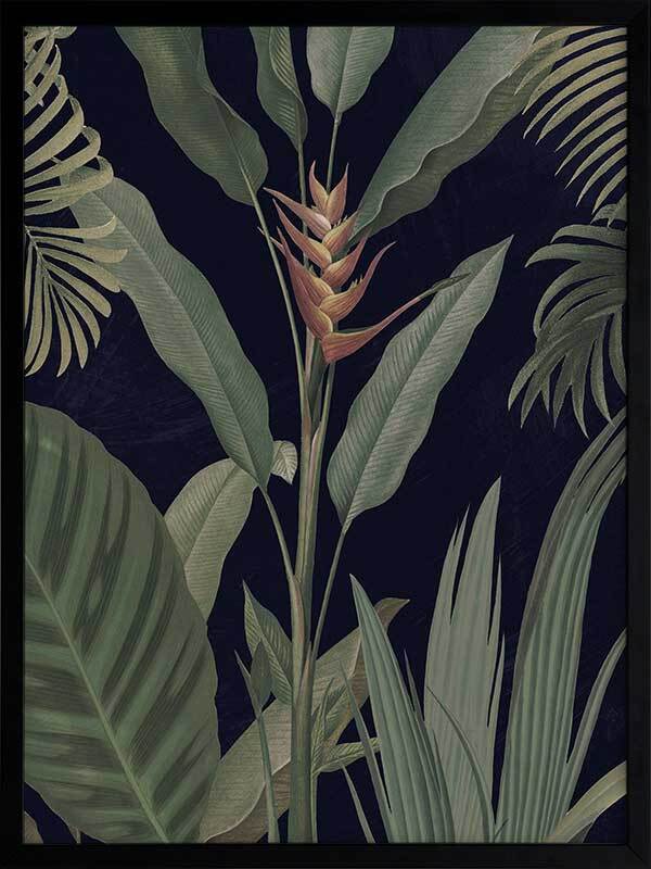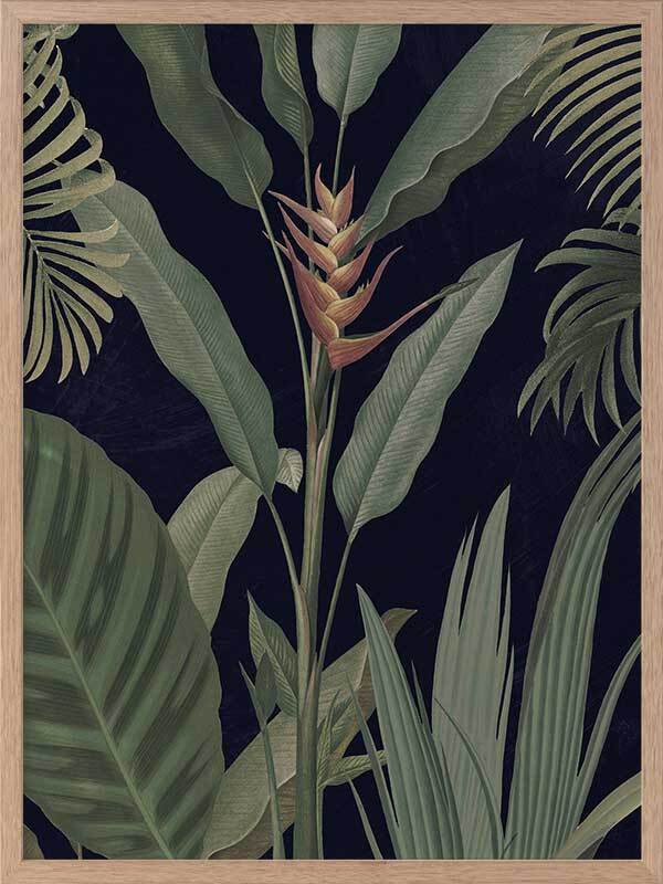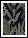 Dark Flora II Framed Art Print - What this moody piece manages to capture so perfectly is the serene beauty of nature's flora, using smooth green tones for the leaves, soft orange-toned violet and yellow blooming flowers, against a deep black background that makes them come alive.