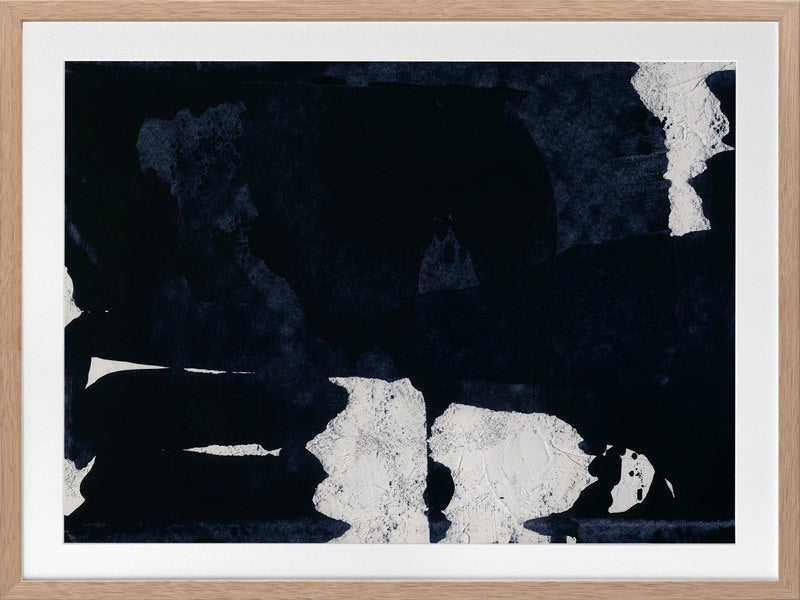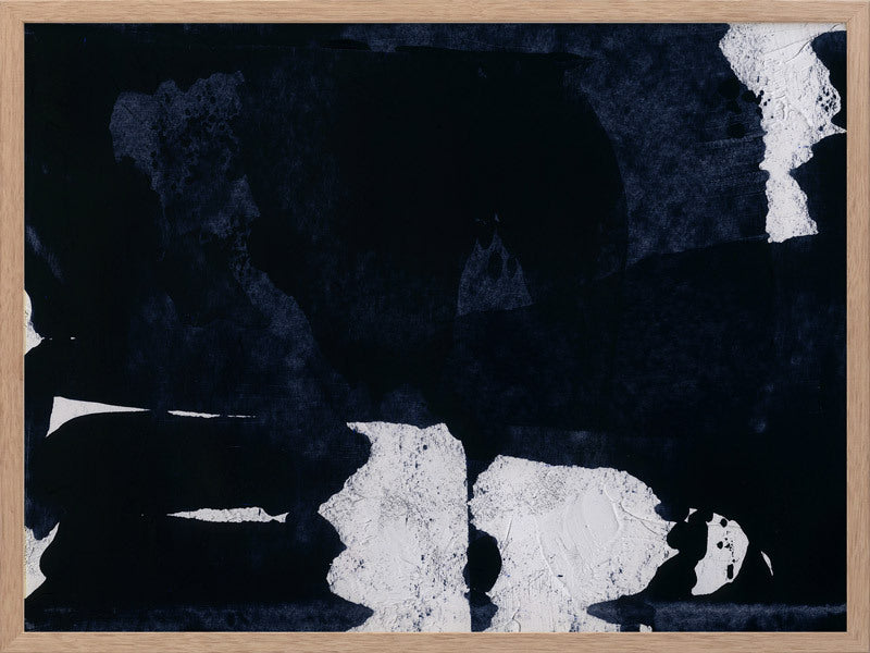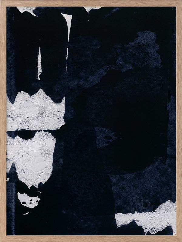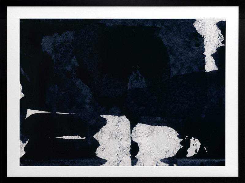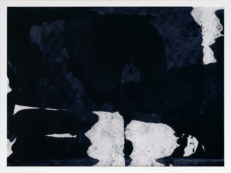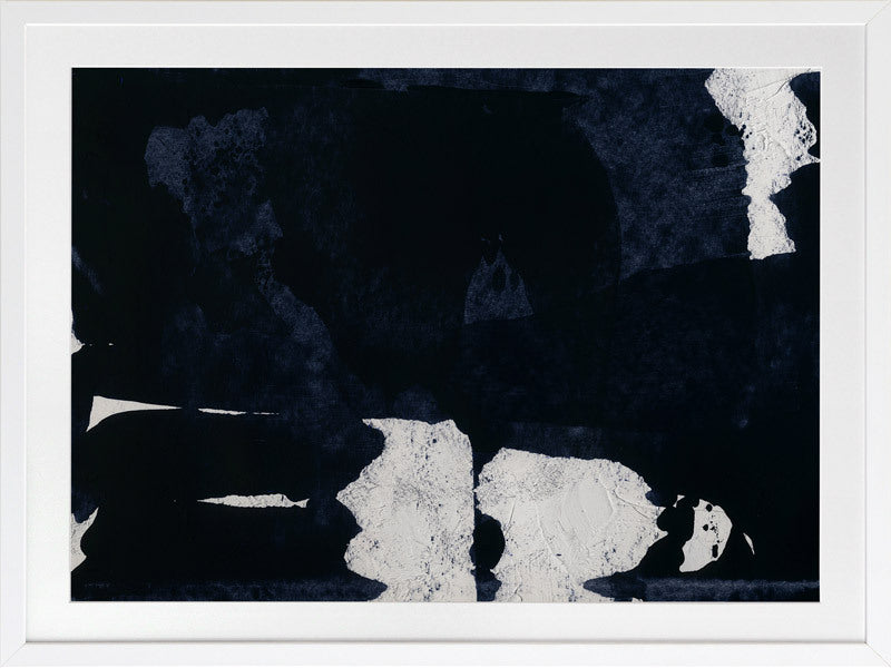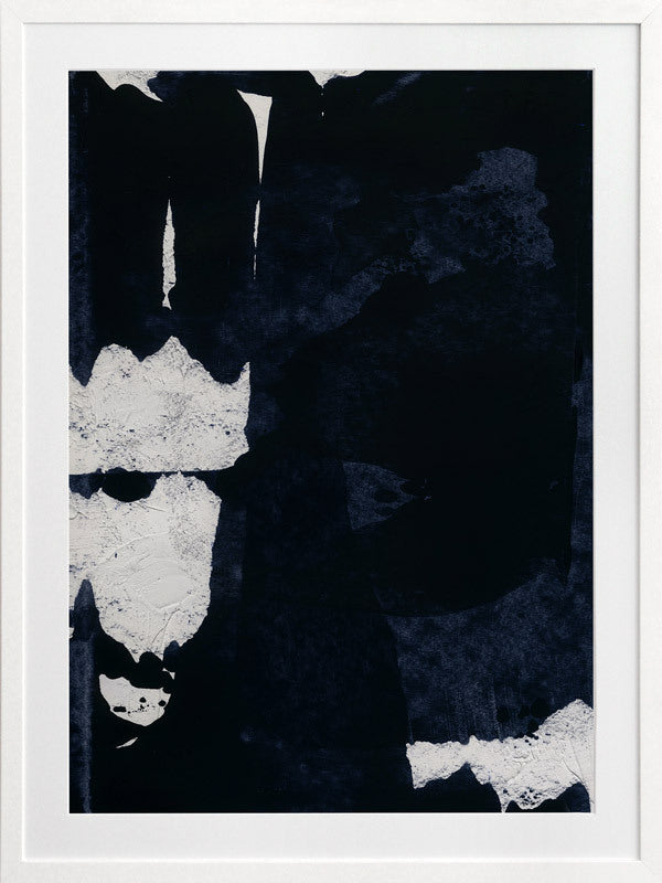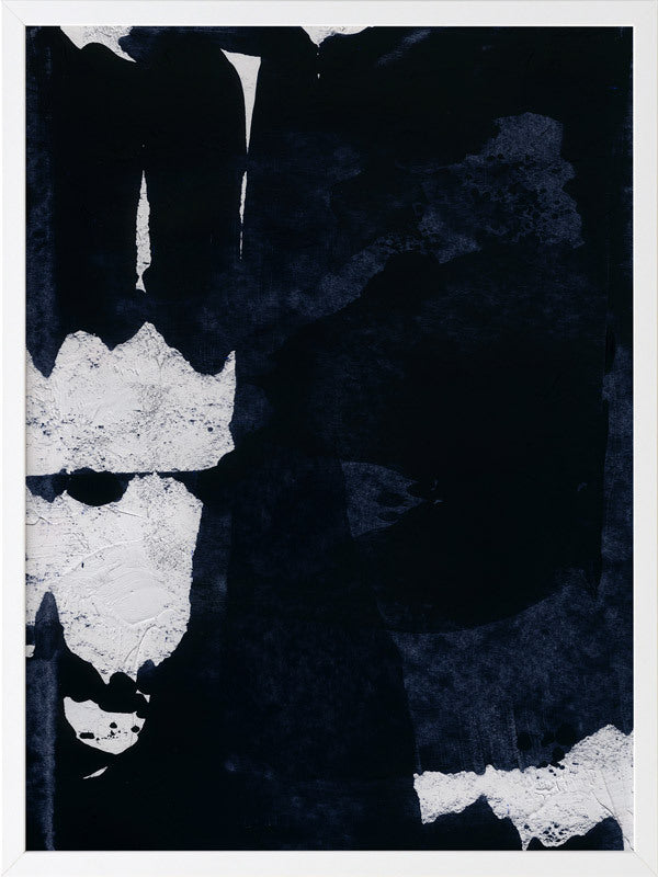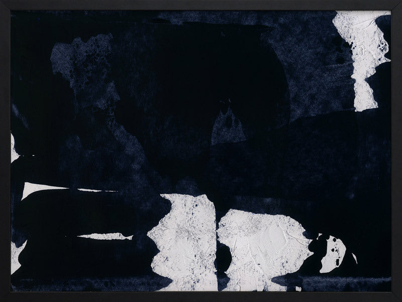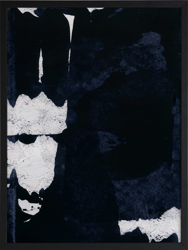 Dark Horse I Framed Print: A dark, moody abstract artwork that contrasts textured navy strokes over a grungy, white background. Pairs with Dark Horse II. 2019 AUTUMN/WINTER COLLECTION: ODYSSEY
