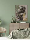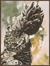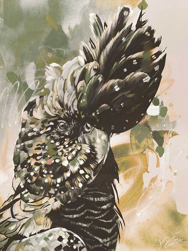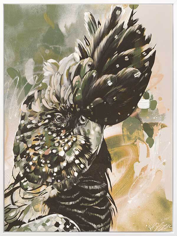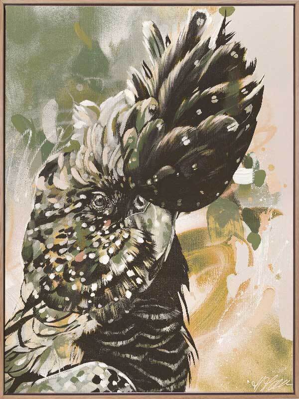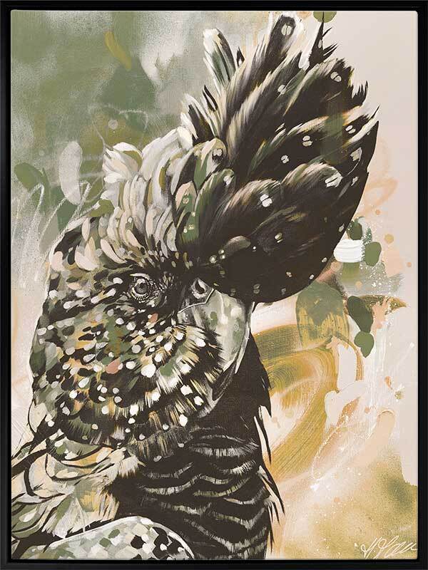 Dawn Nude Canvas Art Print - A pensive Australian black cockatoo catches your gaze, with its majestic display of head feathers and proudly puffed chest. Painted using a muted neutral palette, with touches of sage green to bring it to life, the abstract, chaotic array of brush strokes gives us a glimpse into the exciting life of this cheeky cockatoo.