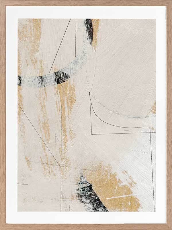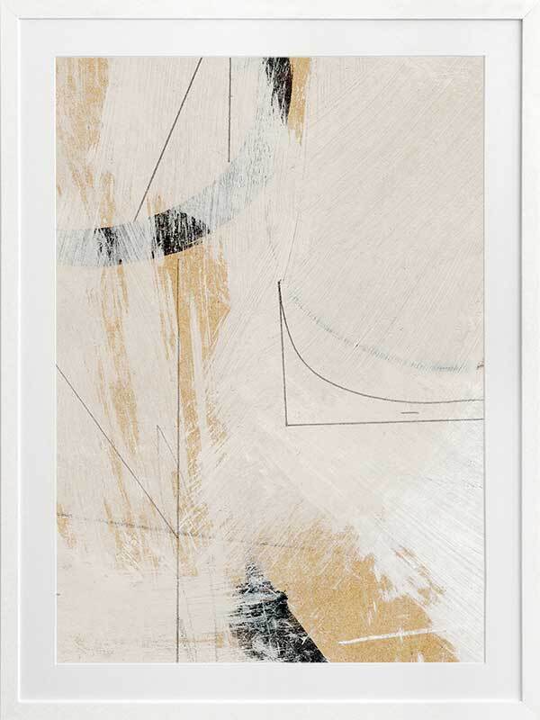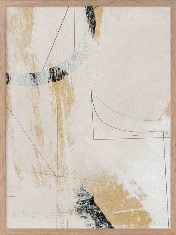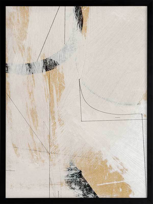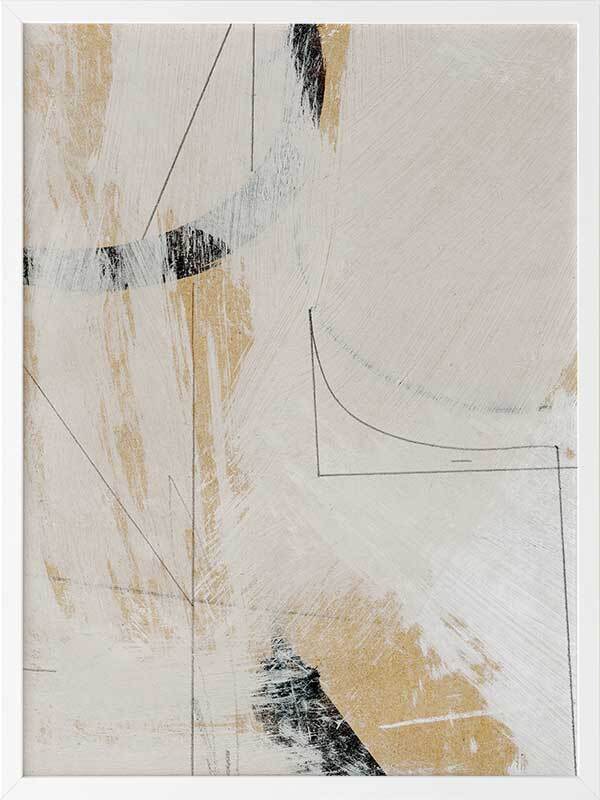 Day to Day Framed Art Print - This artwork is a great way to bring a contemporary style to your home. Featuring white textured brush strokes over a warm golden colour and abstract fine black lines.