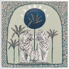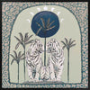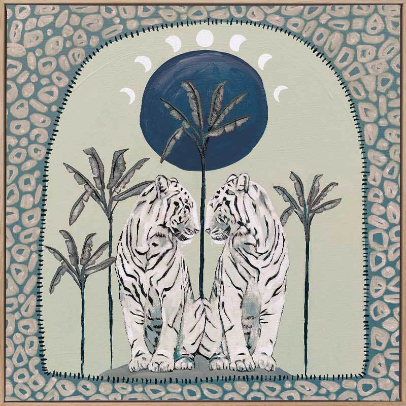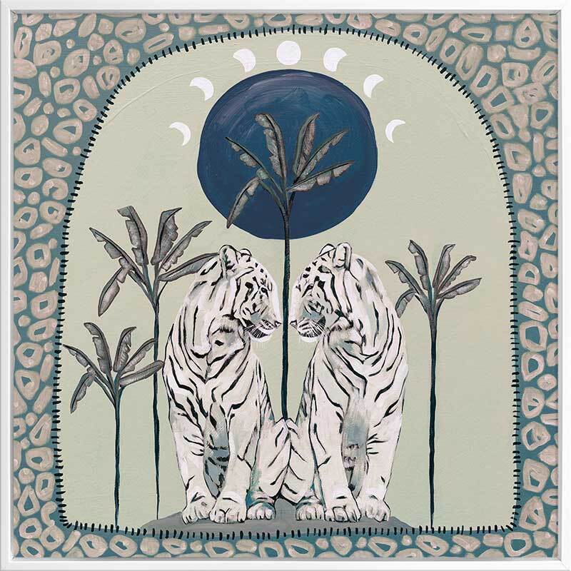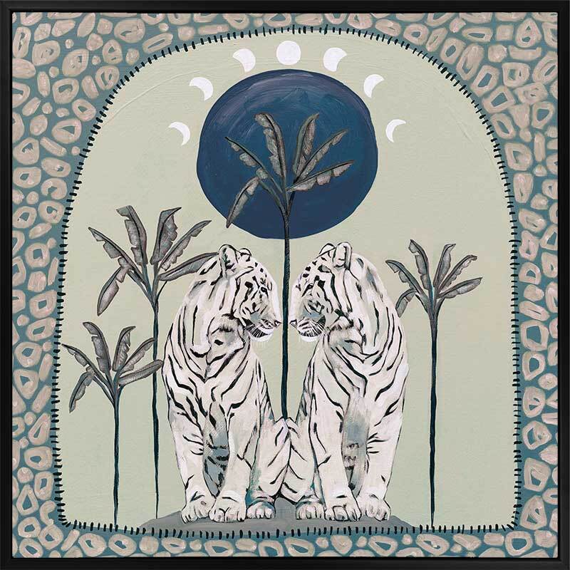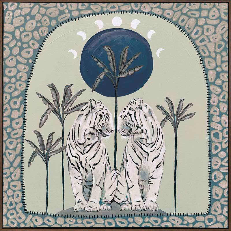 Days On End Green Canvas Art Print - Fun and inviting, this boho-inspired piece features two tigers side-by-side, enjoying a moment among the palm trees below the sunlight. A cool-toned green palette with touches of white and dark blue complements funky shapes and patterns throughout the work.