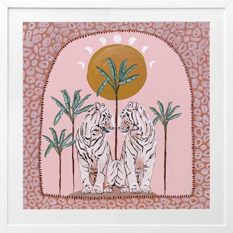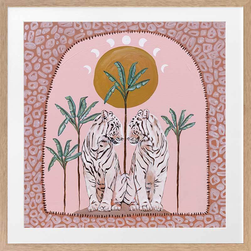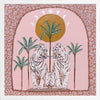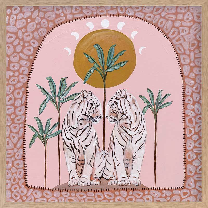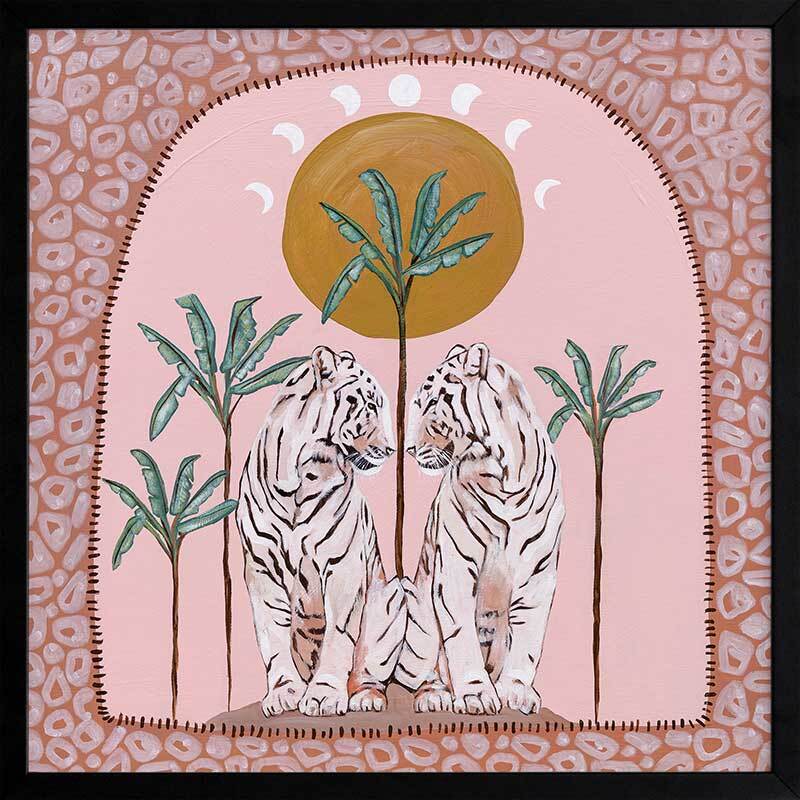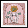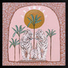 Days On End Pink Framed Art Print - Fun and inviting, this boho-inspired piece features two tigers side-by-side, enjoying a moment among the palm trees below the sunlight. A bright palette of pink tones, green and dark yellow complements funky shapes and patterns throughout the work.