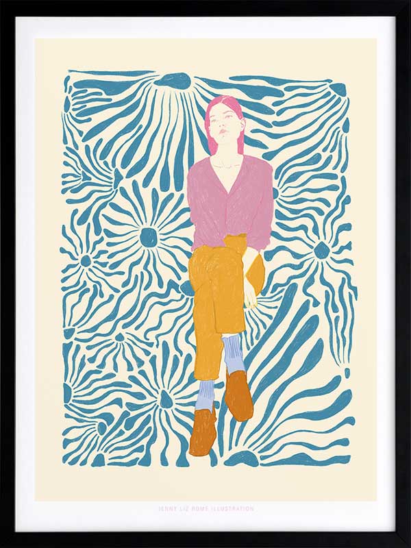 Dazed Portrait II Framed Art Print - Bold, effortless, and undeniably cool - this retro poster art by Jenny Liz Rome brings a dreamlike quality to modern interiors. A stylish woman sits in quiet contemplation in pink, yellow, and orange hues, framed by a psychedelic floral backdrop in blue. The hand-drawn details and vintage-inspired palette make this a must-have for lovers of boho style wall art and retro prints. Whether styled solo or paired with other cool artwork prints, this piece blends effortlessly into eclectic, modern, and bohemian art collections.