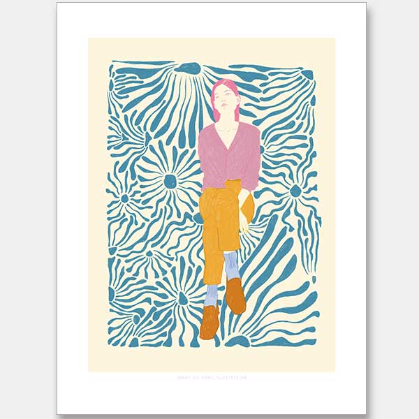 Dazed Portrait II Unframed Art Print - Bold, effortless, and undeniably cool - this retro poster art by Jenny Liz Rome brings a dreamlike quality to modern interiors. A stylish woman sits in quiet contemplation in pink, yellow, and orange hues, framed by a psychedelic floral backdrop in blue. The hand-drawn details and vintage-inspired palette make this a must-have for lovers of boho style wall art and retro prints. Whether styled solo or paired with other cool artwork prints, this piece blends effortlessly into eclectic, modern, and bohemian art collections.