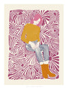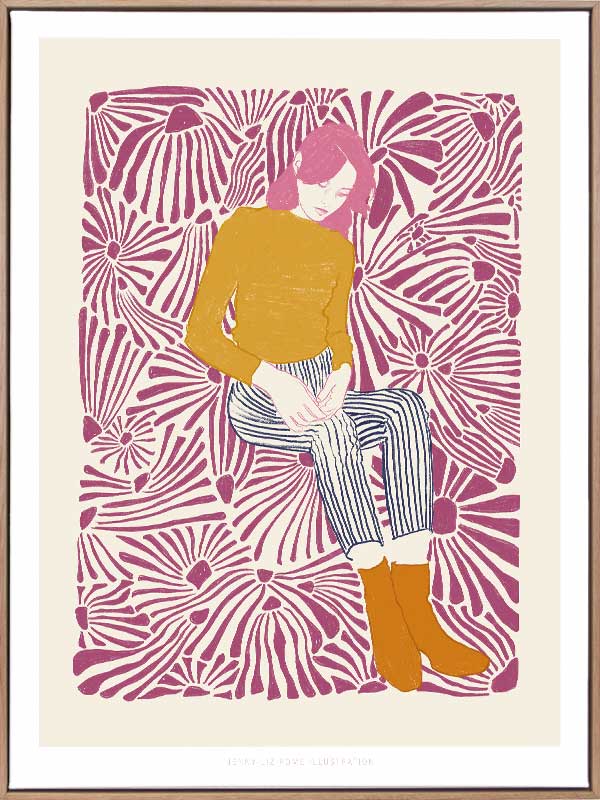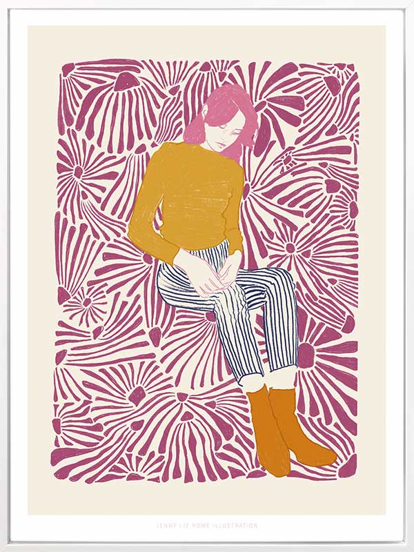 Dazed Portrait III Canvas Art Print - Bold, effortless, and undeniably cool - this retro poster art by Jenny Liz Rome brings a dreamlike quality to modern interiors. A stylish woman sits in quiet contemplation in pink, yellow, blue, and orange hues, framed by a psychedelic floral backdrop in dark pink. The hand-drawn details and vintage-inspired palette make this a must-have for lovers of boho style wall art and retro prints. Whether styled solo or paired with other cool artwork prints, this piece blends effortlessly into eclectic, modern, and bohemian art collections.