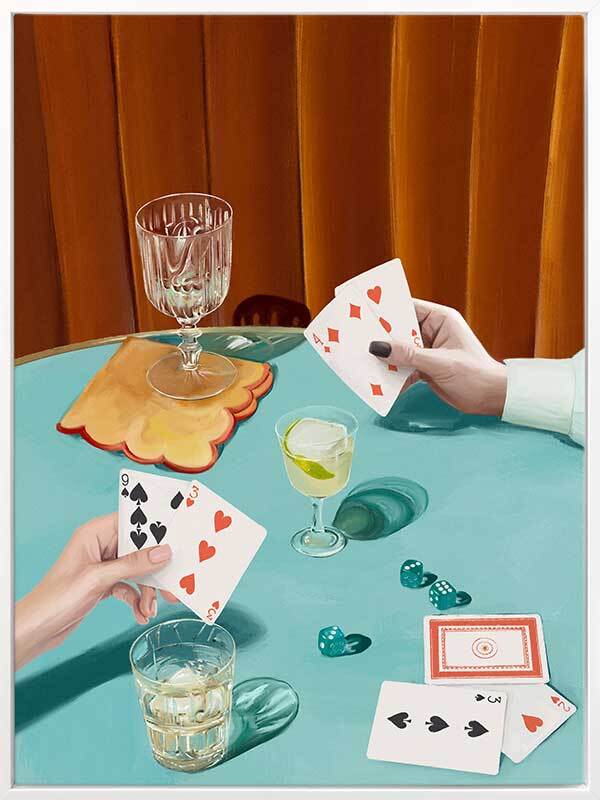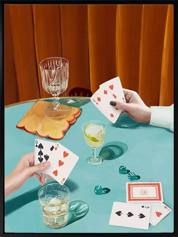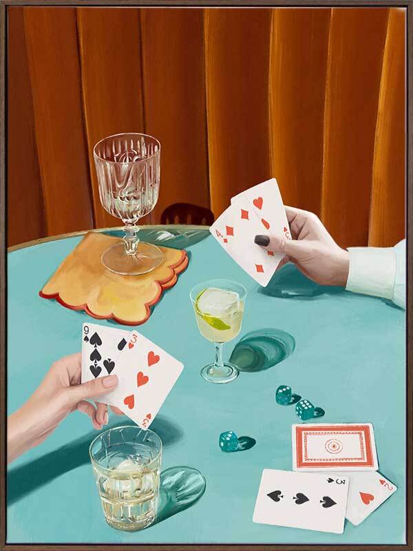 Deal Me In Canvas Art Print - Anyone up for a card game? This striking art print from Interior Designer Shaynna Blaze's exclusive collection captures the essence of retro leisure. Set against a backdrop of bold art deco-inspired colours, the focus is on two players with cocktails at the ready, enjoying a card game. The vibrant teal table and dark golden velvet curtain create a mood of elegance, where glamour and fun collide. Incorporating elements of high fashion, this artwork evokes a sense of stylish, carefree moments. Whether it's in your living room, where it invites conversation and intrigue, or as a statement piece in a game room, this retro-inspired wall art is perfect for lovers of vintage-style art.