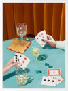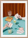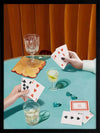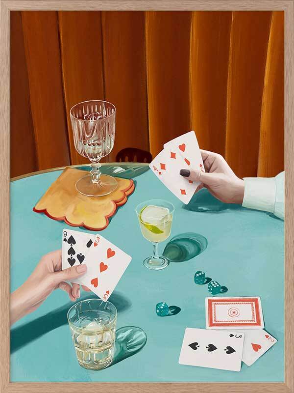 Deal Me In Framed Art Print - Anyone up for a card game? This striking art print from Interior Designer Shaynna Blaze's exclusive collection captures the essence of retro leisure. Set against a backdrop of bold art deco-inspired colours, the focus is on two players with cocktails at the ready, enjoying a card game. The vibrant teal table and dark golden velvet curtain create a mood of elegance, where glamour and fun collide. Incorporating elements of high fashion, this artwork evokes a sense of stylish, carefree moments. Whether it's in your living room, where it invites conversation and intrigue, or as a statement piece in a game room, this retro-inspired wall art is perfect for lovers of vintage-style art.